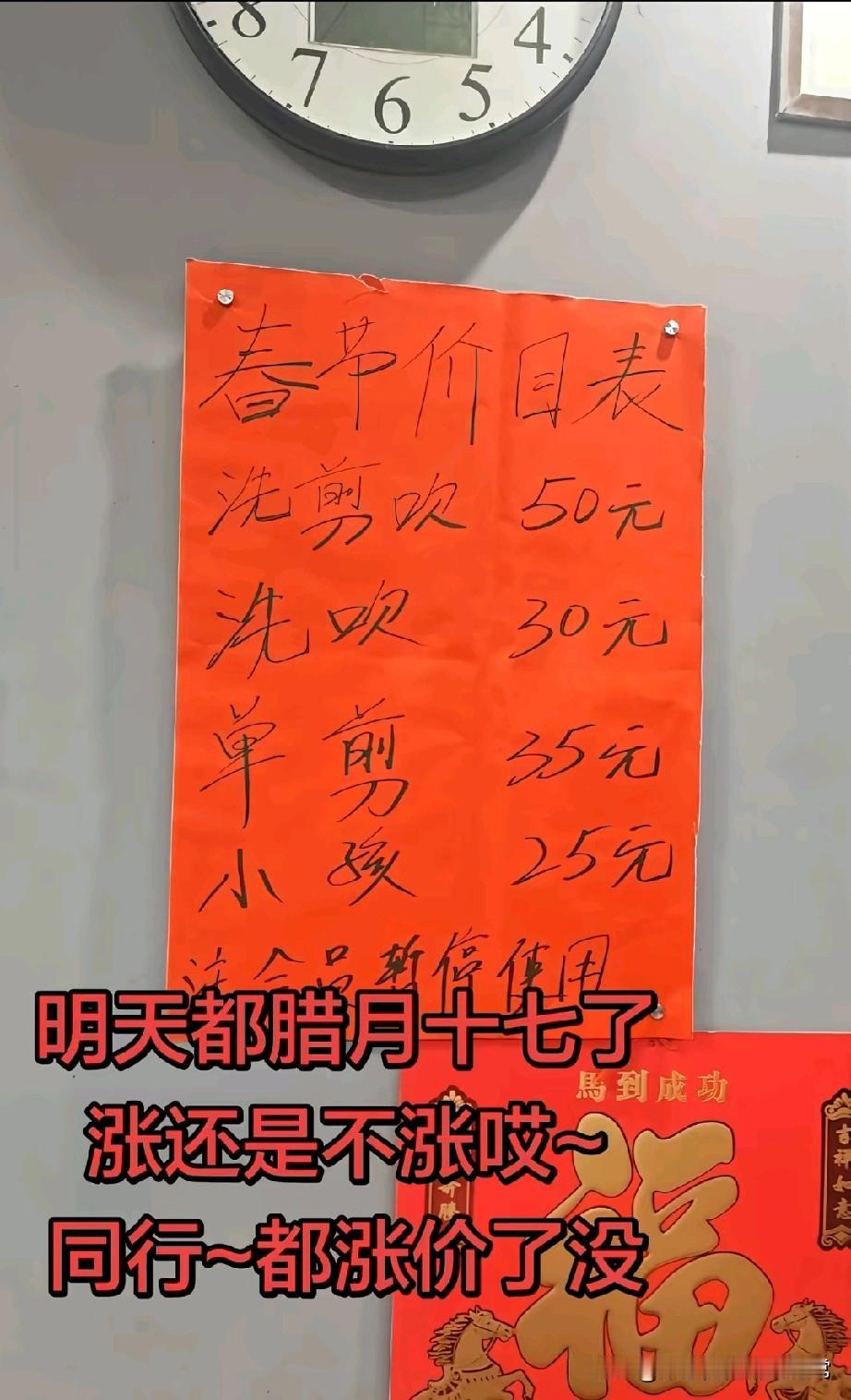 理发店春节涨价,一天一个价还合法 打工人直呼剪不起! 今天刷到这张理发店的春节价目表,直接看懵了:洗剪吹从平时30块涨到50,单剪也飙到35,小孩剪头都要25块。 老板还在纠结“涨还是不涨”,可同行早就涨完价,等着赚一波过年钱了。 这已经不是新鲜事了,每年春节前,理发、洗车、美甲这些刚需服务都要坐地起价,美其名曰“春节服务费”,而且完全合法,因为属于市场调节价。 打工人辛辛苦苦一整年,连剪个头发都要被割韭菜,真的太无奈了。 你遇到过春节涨价最离谱的服务是什么?评论区聊聊,咱们一起吐槽下这些“趁年打劫”的商家!
