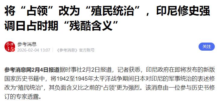 最近,日本媒体报道,印尼将历史书中日本在二战时期对印尼的侵略进行了重新表述,从原来的“军事占领”改为“殖民统治”,印尼此举有何用意? 这次修改绝非临时起意、草率为之,印尼政府专门组建了一支由120多名专家组成的团队,专门负责修订国家历史书,原本计划在去年8月印尼独立80周年之际完成,就是为了给国家独立纪念日一份庄重的献礼。 可因为要反复核对史实、严谨打磨内容,生怕有半点疏漏,才推迟到了这个月才最终完成,这份细致与坚定,着实令人敬佩。 最让人感慨的是,在之前的印尼历史书中,荷兰殖民印尼300多年,被明确称为“殖民统治”,可日本在二战期间统治印尼三年半,却一直被叫做“军事占领”。 同样是外国入侵,同样是压迫民众、掠夺资源,同样是让印尼百姓陷入水深火热,两种截然不同的表述,显得格外刺眼,也让日本当年的罪行被悄悄模糊了几十年。 如今印尼终于下定决心修改,就是要分清是非、厘清界限,让这段被歪曲的历史泾渭分明,再也不给任何人曲解、洗白的空间。 说到这里,就不得不提一个极具反差的事实:当年日本入侵印尼时,还打着“大东亚共荣圈”的旗号,谎称自己是来“解放”印尼、帮他们摆脱荷兰殖民的,不少印尼民众一开始还被这种谎言蒙蔽,对日军抱有期待。 可现实却狠狠打了所有人的脸,日军占领印尼后,根本没有给当地民众带来任何“解放”,反而变本加厉地实施压迫——疯狂掠夺印尼的石油、橡胶等战略资源,强征几十万印尼人当苦工,让他们在矿场、工地里干最苦最累的活,吃连牲口都不如的食物,很多人最终活活累死、饿死,再也没能回到家人身边。 更令人愤慨的是,日军还强制印尼人学日语、敬天皇,试图摧毁当地的本土文化,这和荷兰当年的殖民统治,没有半点区别,所谓的“解放者”,不过是日本掩盖侵略野心的遮羞布,其狼子野心昭然若揭。 印尼之所以要把“军事占领”改成“殖民统治”,最核心的用意,就是要还原历史的本来面目。 “军事占领”这个词,本身就有模糊不清的地方,容易被人曲解成“战争期间的临时占据”,仿佛日本当年只是路过,没有长期殖民、掠夺的意图;可“殖民统治”四个字,就把话说得明明白白,直接定性日本当年的行为,就是和荷兰一样的殖民压迫,就是赤裸裸的侵略,没有任何辩解的余地。 负责修订的专家也明确表示,不管统治者是西方人还是亚洲人,印尼民众遭受征服、胁迫和暴力的经历,本质上没有任何不同,用“殖民统治”,才能准确反映那段真实的苦难历史。 这一举动,也和印尼总统普拉博沃的历史观高度契合。这位总统长期以来,就对历史上的外国殖民统治持坚决的批评态度,他反复强调,印尼的独立不是别人施舍的,不是任何国家的“善意”赐予的,而是印尼人民自己长期斗争、流血牺牲换来的。 这次修改历史表述,就是要让所有印尼人,尤其是年轻人,记住这段苦难,明白独立的来之不易,凝聚起民族共识,坚定守护国家主权和民族尊严,不再被“日本曾帮助印尼独立”这样的谎言误导。 更有意思的是,日本得知印尼要修改历史书后,彻底慌了,悄悄动了不少歪心思,一边承诺给印尼提供几十亿美元的高铁贷款,一边还想给印尼教育部派“历史顾问”,说白了就是想阻挠修订工作,让印尼继续模糊这段历史,帮自己洗白罪行。 可这次印尼态度十分强硬,直接拒绝了日本的所有要求,丝毫没有妥协,这份硬气,打破了日本这些年在东南亚的伪装。 这些年,日本一直在东南亚花钱公关,试图美化自己的侵略历史,甚至拍动画、改词条,谎称自己当年是“结束西方殖民、建立新秩序”,可印尼的这次修改,就像一记重拳,撕碎了日本的遮羞布。 如今,印尼的举动已经带动了周边国家,菲律宾已经启动了历史教材修订审查,马来西亚教育部也在开会讨论,准备跟着印尼的脚步,纠正教材里关于日本的错误描述。 这也告诉我们,历史真相从来都不会被永远掩盖,哪怕过去几十年,哪怕有人刻意歪曲,总有国家会站出来,坚守正义、还原真相。