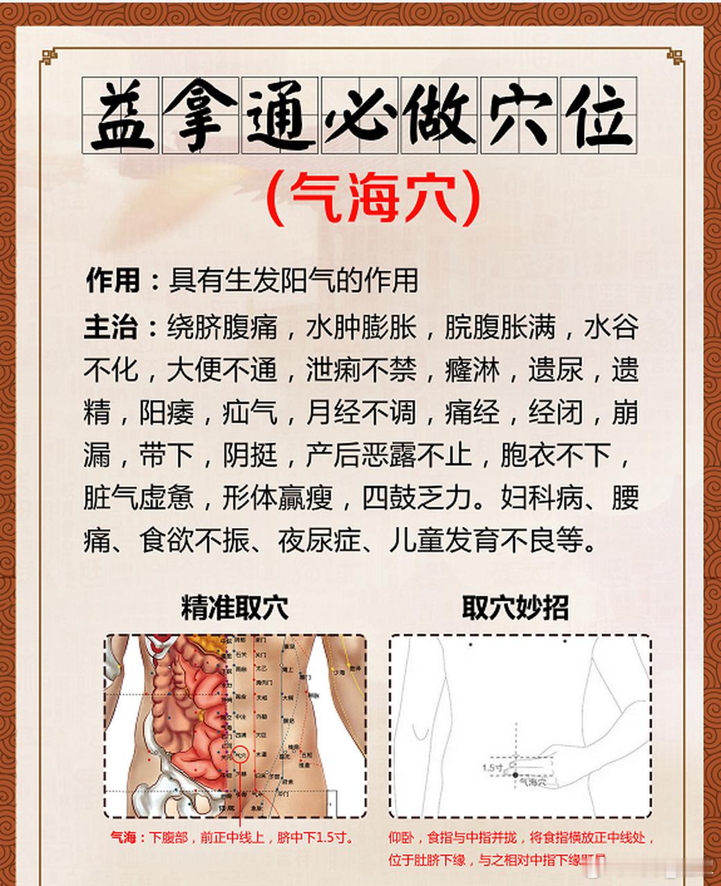气海穴的妙用此外气海也是治疗男女生殖系统疾病的要穴。本穴属于任脉,任脉为“阴脉之海”,“主胞胎”,有补肾虚、固精血的作用。男子肾精亏虚、遗精、早泄。女子的月经不调、痛经、经闭、带下、阴挺、不孕症等病均可治疗,常与三阴交相互配合使用。穴位位置:在下腹部,前正中线上,当脐中下1.5寸。取穴方法:在下腹部,正中线上,肚脐中央向下与关元穴(在下腹部,正中线上,肚脐中央向下4横指处即是关元穴)之间的中点处即是。操作方法:艾灸:用艾条温和灸(将艾条燃着的一端与施灸部位的皮肤保持一寸左右距离,使患者有温热而无灼痛的一种方法。)或艾炷隔姜灸(将生姜切成约2毫米厚薄片,用针在其中间穿几个孔,置于穴位上,把艾炷放在姜片上点燃施灸)的方法,隔天灸一次,每次15-20分钟,或艾炷灸5-7壮。以温热为度,灸到局部皮肤红晕,达到热量内透,自觉腹部温热的舒适状态。灸气海能生发和培补元气,滋养百脉,益肾固精,保健强身,解除疲劳。按揉:按揉气海穴时,首先把手掌搓热,可以右掌心紧贴于气海的位置,按照顺时针方向按揉100到200次,然后再以左掌心逆时针方向按揉100到200次,按揉至有热感即有效果。