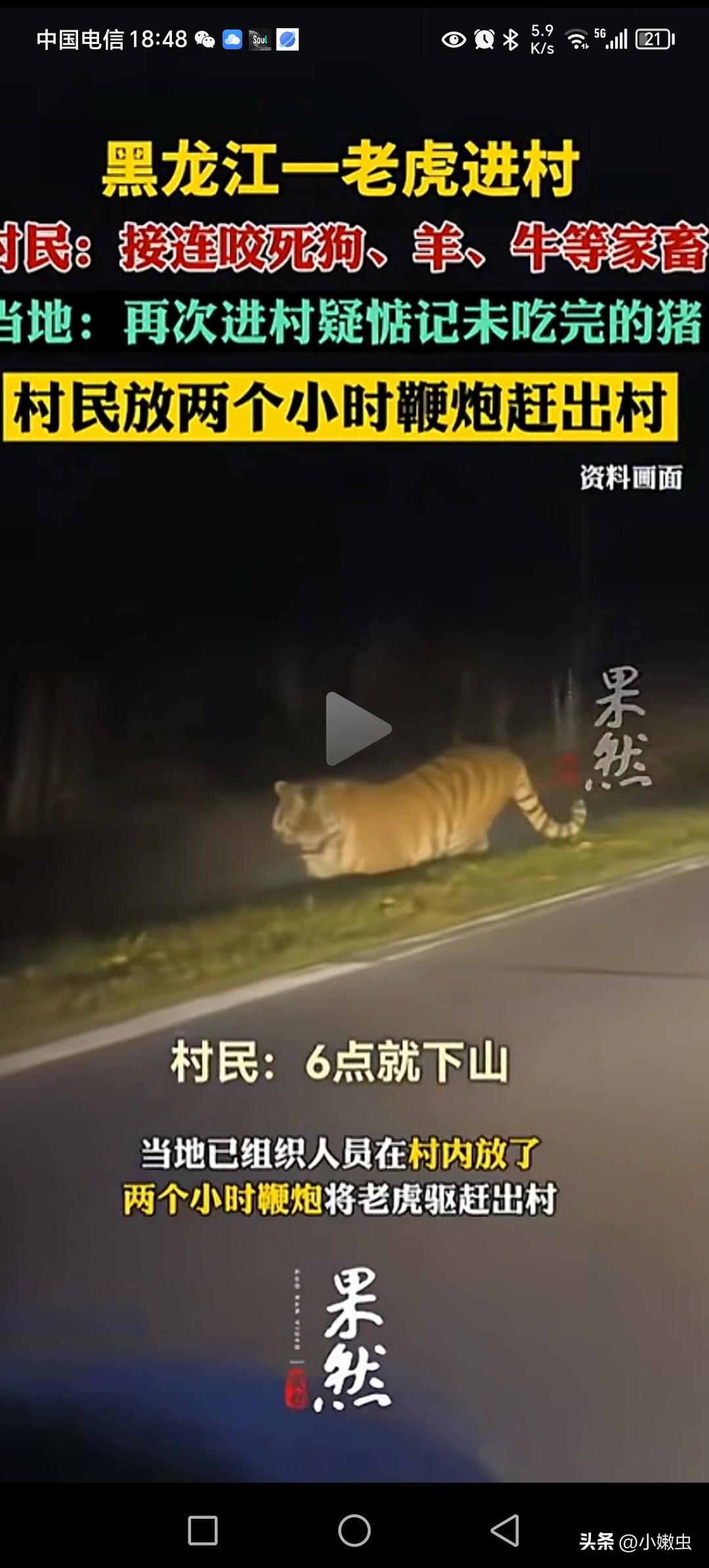 东北农村哪里来的夜生活,冬天敢去朋友家喝酒乱坠吗? 这么大只猫,冬天在村里头逛来逛去。 你敢出门吗? 老虎来了。放两个小时鞭炮才将她驱赶。 不过这虎真的好壮啊! 头又那么大,叼100斤内动物可以跑。 东北人过年,怎么防老虎。 家里有没有用特殊材质,加固防虎。