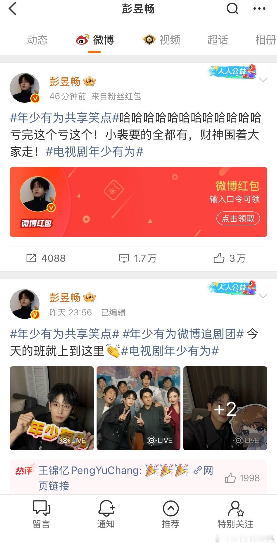 错过彭昱畅红包彭昱畅连发九天红包,用《年少有为》口令把宠粉玩出新高度,演得了反卷老板,发得起万元红包,这样的实力派主演才是内娱刚需!
