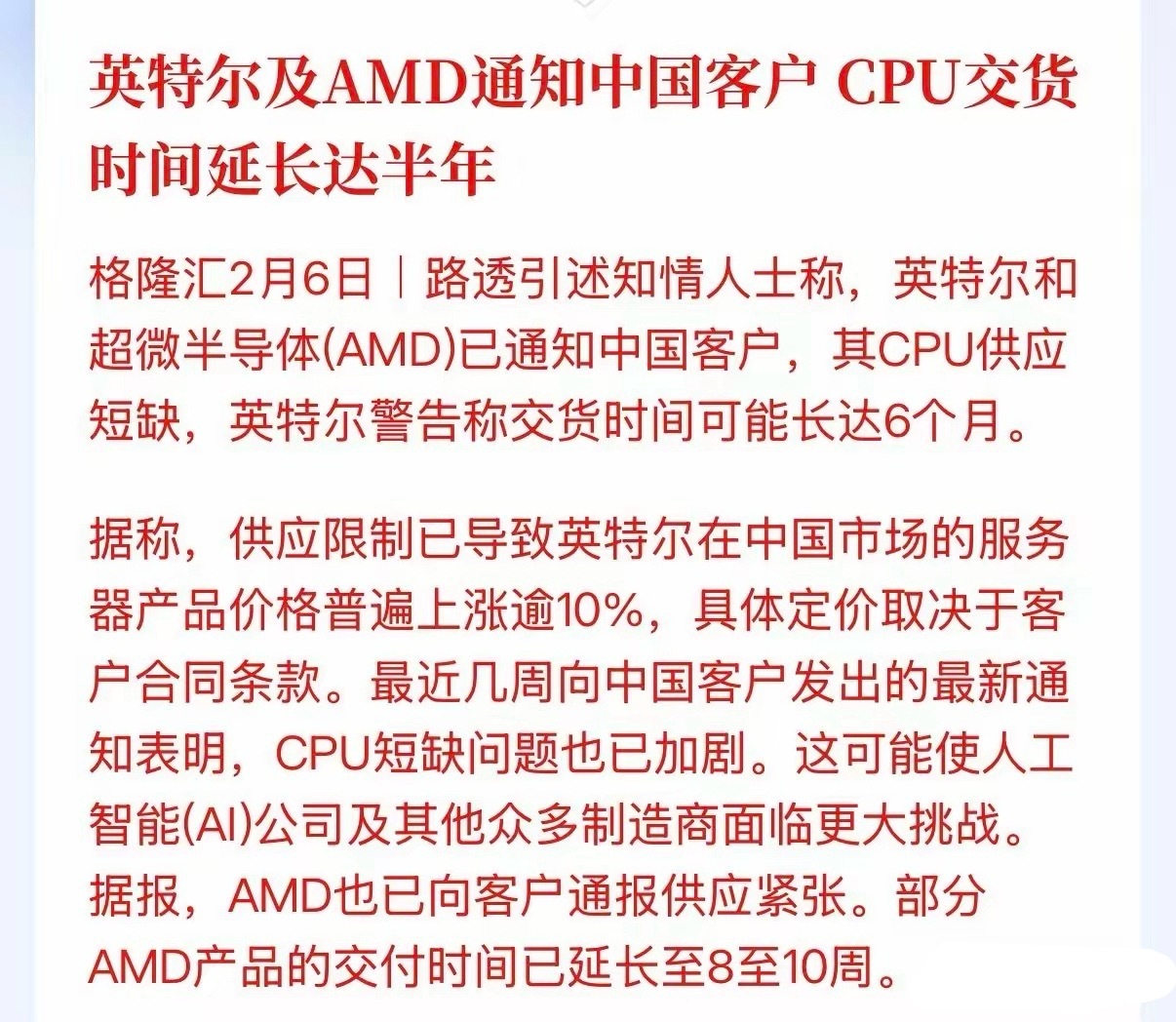 重磅消息,CPU短缺来了。英特尔和AMD的CPU供应短缺,已经通知中国客户,交货时间要延长6个月。市场上CPU的价格已经上涨了10%。原来是存储芯片短缺,现在已经发展到CPU短缺,可以围绕这条路线挖掘有价值的上市公司。从大A看,从前服务器CPU生产的上市公司主要有海光信息,龙芯中科,中国长城,国芯科技。整机生产有,中科曙光,浪潮信息,紫光股份,中兴通讯等。