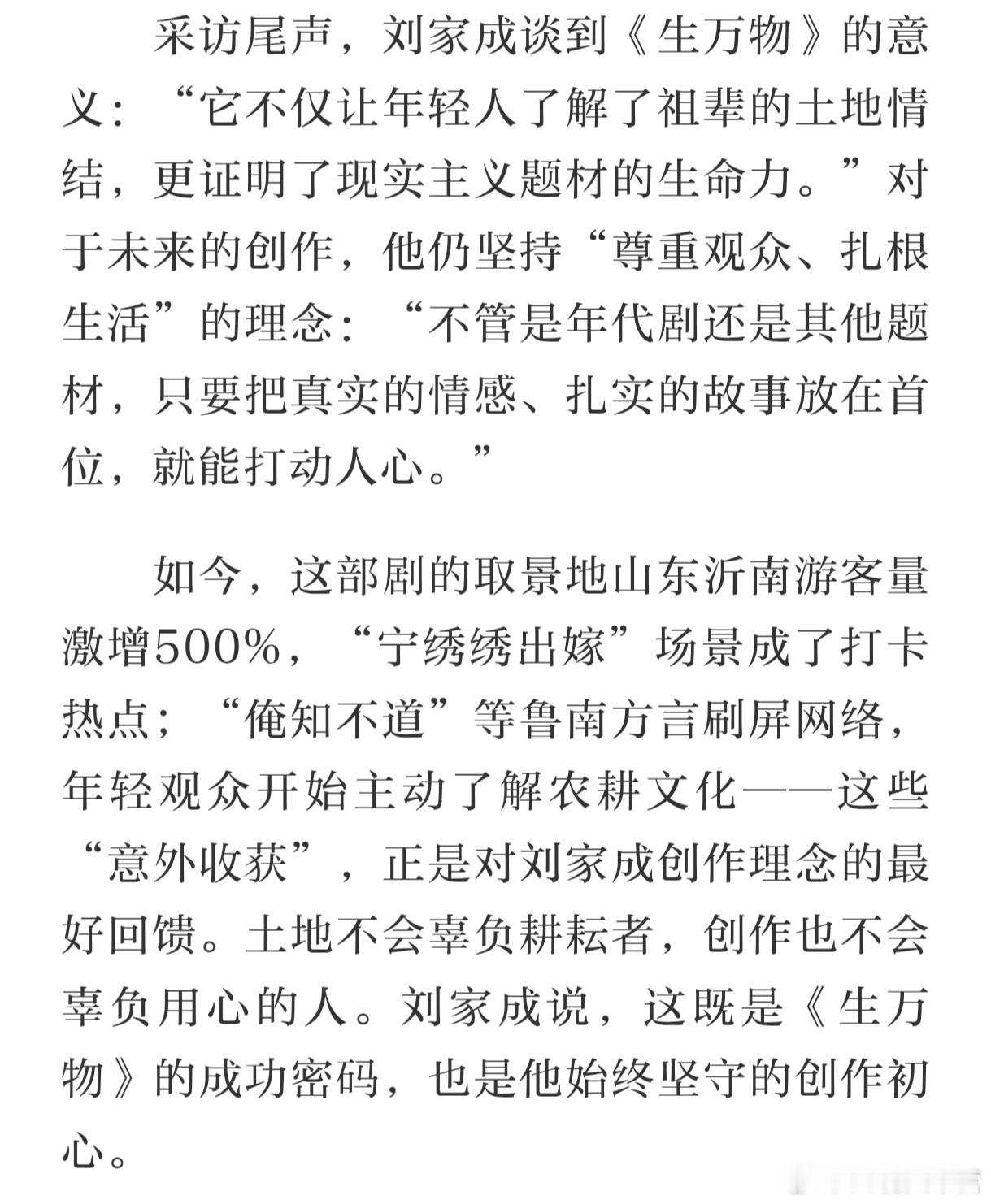 如今,这部剧的取景地山东沂南游客量激增500%,“宁绣绣出嫁”场景成了打卡热点;“俺知不道”等鲁南方言刷屏网络,年轻观众开始主动了解农耕文化——这些“意外收获”,正是对刘家成创作理念的最好回馈。土地不会辜负耕耘者,创作也不会辜负用心的人。刘家成说,这既是《生万物》的成功密码,也是他始终坚守的创作初心。生万物杨幂生万物
