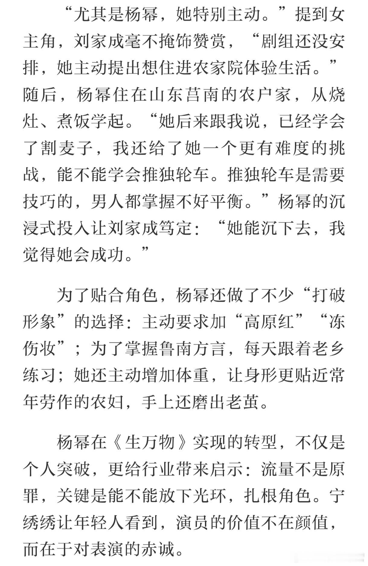 ——“尤其是杨幂,她特别主动。”提到女主角,刘家成毫不掩饰赞赏,“剧组还没安排,她主动提出想住进农家院体验生活。”随后,杨幂住在山东莒南的农户家,从烧灶、煮饭学起。“她后来跟我说,已经学会了割麦子,我还给了她一个更有难度的挑战,能不能学会推独轮车。推独轮车是需要技巧的,男人都掌握不好平衡。”杨幂的沉浸式投入让刘家成笃定:“她能沉下去,我觉得她会成功。”