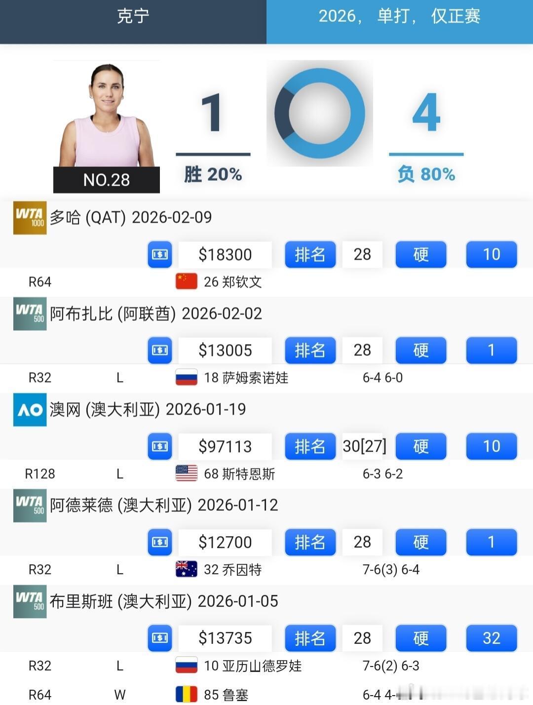 肯宁本赛季单打1胜4负,遭遇了一波4连败!