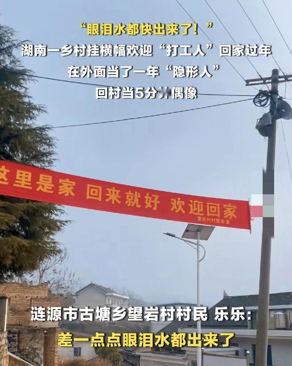 湖南一乡村村委在村口挂起了5条横幅:欢迎各地在外打工的游子回家回来就好。不少网友发文称看到这些横幅,眼泪一下子就出来了。最简单的语言却藏着相亲人对他们的挂念。很多年轻人过年不愿意回家,就是怕家里人说三道四,家里的风气都是互相攀比,混的不好的人是一点都不敢回去,也不想回去。