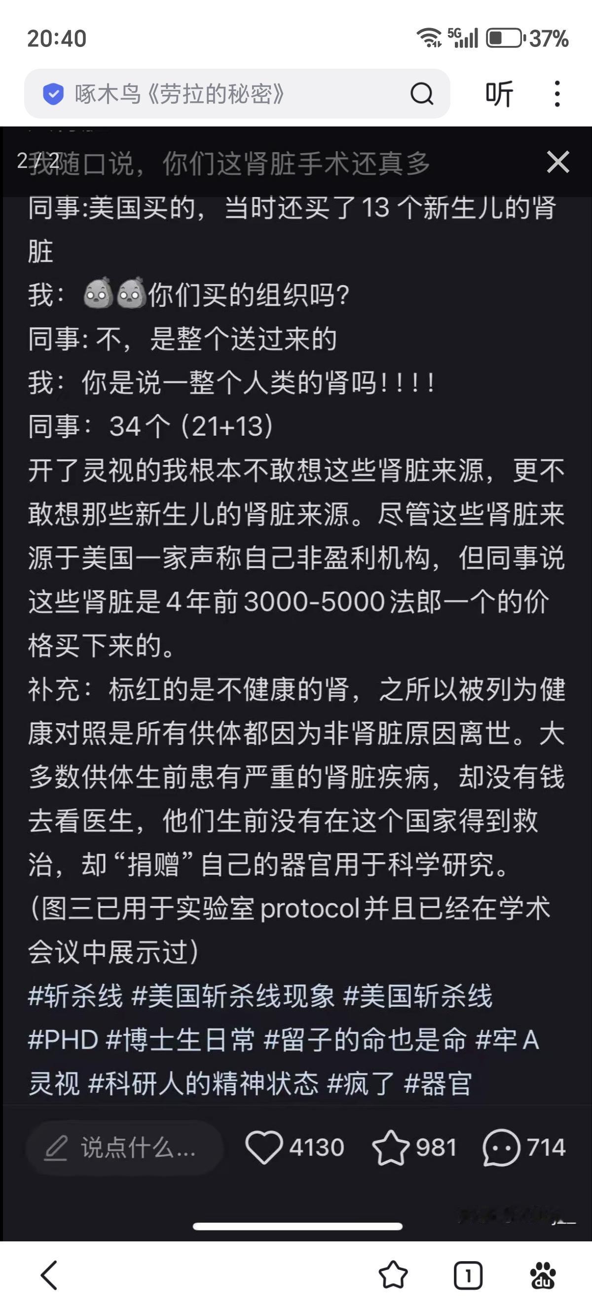 瑞士一名中国医学生曝光了实验室里的34个人体肾脏——21个成人,13个新生儿。这些器官以每个3000-5000法郎从美国“非营利机构”购得,供体全是因贫穷无法就医最终死亡的底层人群。 生前被医疗系统抛弃,死后器官却被标价出售,成为发达国家实验室里的耗材。这个帖子再一次证实了“斩杀线”的存在:穷人的身体,连死亡都能被转化价格。 帖子发出一天,她遭遇“开盒”人肉,被实验室直接开除。揭露者消失,问题继续沉默运转——这或许正是最完整的“斩杀线”:当底层生命成为耗材,连追问的眼睛都不被允许存在。 这个孩子还是天真了,牢A最后也是以跑路回国告终,现在希望这个孩子还能跑路回来。