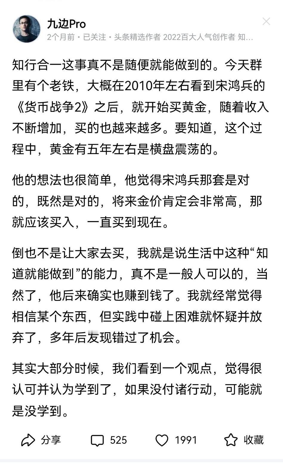 今天看到九边写的一篇文章,挺有感触。 说的是有个投资者,10年左右看宋鸿兵的《货币战争2》,笃信作者的观点,觉得黄金以后肯定会越来越值钱。 于是他就一直买一直买,中间经历过好几年的横盘震荡,都没有放弃,一直买到现在,真牛啊。感觉熬出来了。 想想自己,也是看了很多理财投资的书,每次都觉得作者的观点很对,但是从来没有完全按照那个思路去执行过。 买的时候犹犹豫豫,只学到表面,没学到精髓,只买了一点点,后面只能拍断大腿。