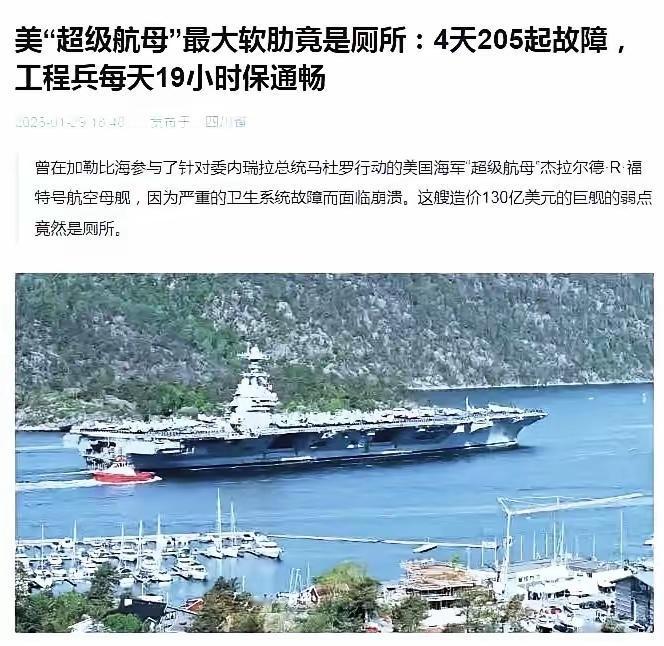 美国福特号航空母舰4天205起故障。 虽然只是厕所问题,但是以小见大。 美国人已经印度化了吗? 连这么重要的镇国神器都可以偷工减料? 还不知道其他地方都已经烂成什么样子了。 不过这些重要吗? 重要的是史密斯专员的钱包估计都已经快被撑爆了吧? 最后讲个笑话,美国是一个没有贪污腐败的国家。