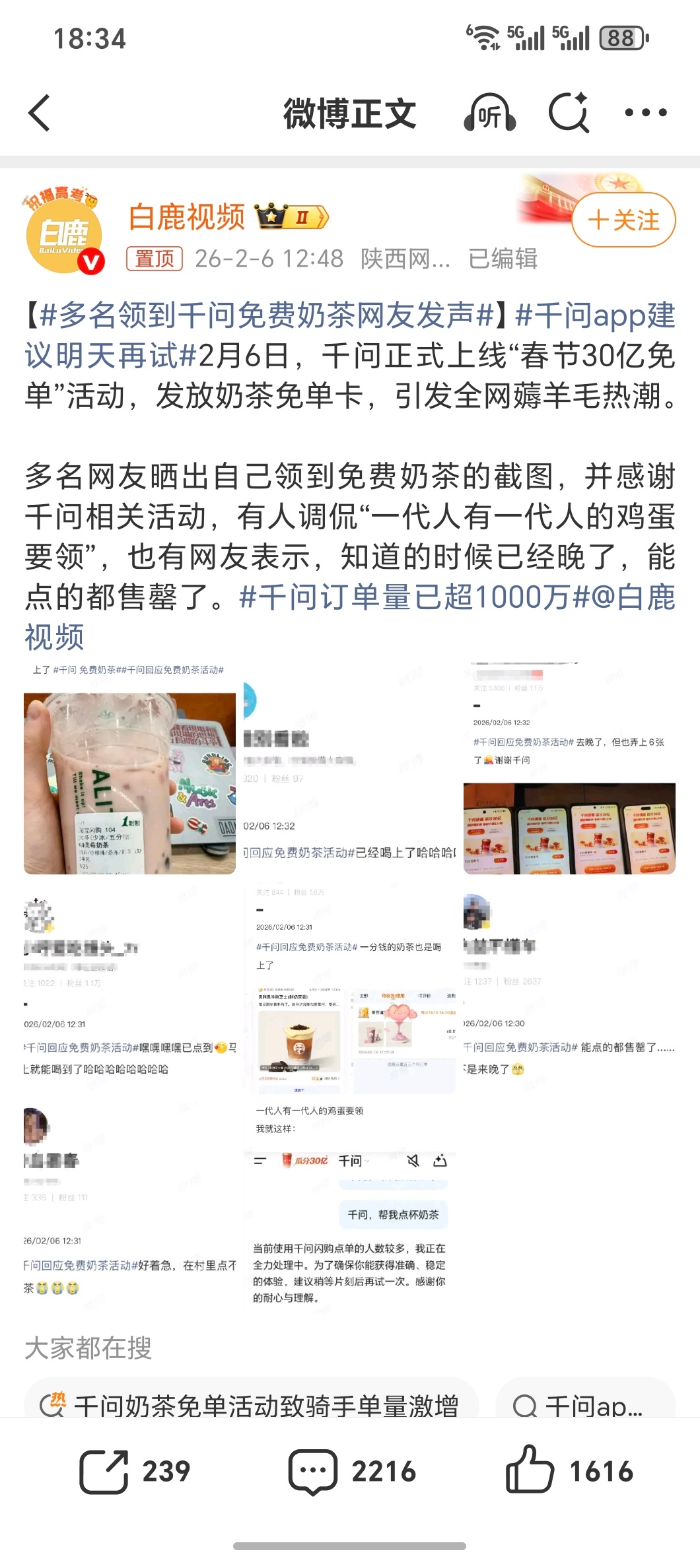 多名领到千问免费奶茶网友发声哈哈哈一代人有一代人的鸡蛋阿里千问免费奶茶,明显就是对冲腾讯元宝前两天元宝提现了4块4毛4今天的奶茶我刚才看到,你们赶上了吗?
