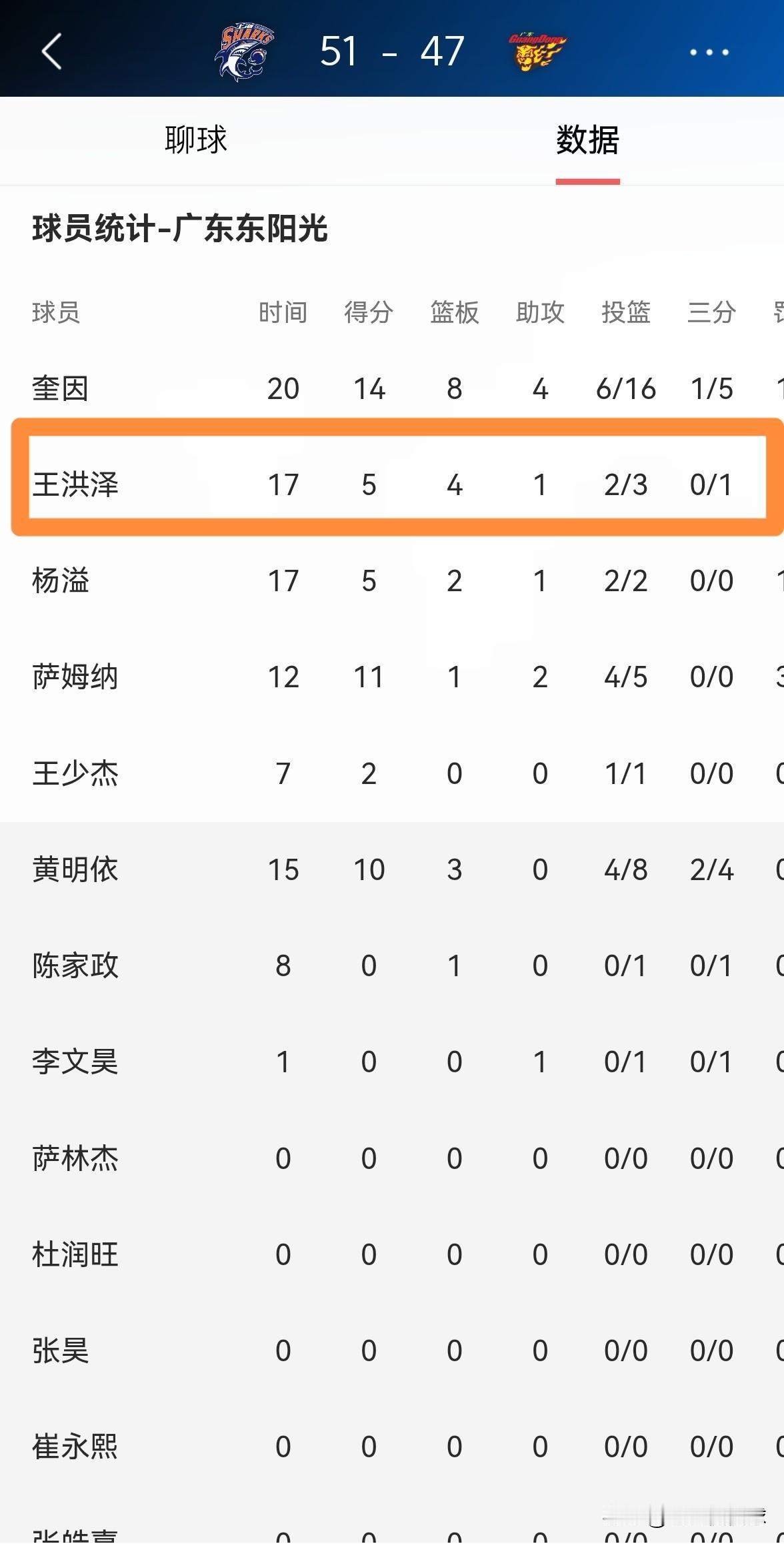 广东东阳光小将王洪泽真是勇气可嘉!在今天进行的广东东阳光和上海久事的CBA俱乐部杯1/4决赛中,目前双方半场战罢,广东东阳光以47:51落后于对手。在前两节比赛中,王洪泽在面对洛夫顿、王哲林两大明星内线时敢拼敢打,展现出了初生牛犊不怕虎的勇气,他在首发出战的17分钟里,投篮3中2,其中三分球1中0、罚球2中1得到5分4篮板1助攻1盖帽,不过有3次犯规。 作为一名年仅18岁的小将,王洪泽敢于直面挑战,可以说是勇气可嘉。