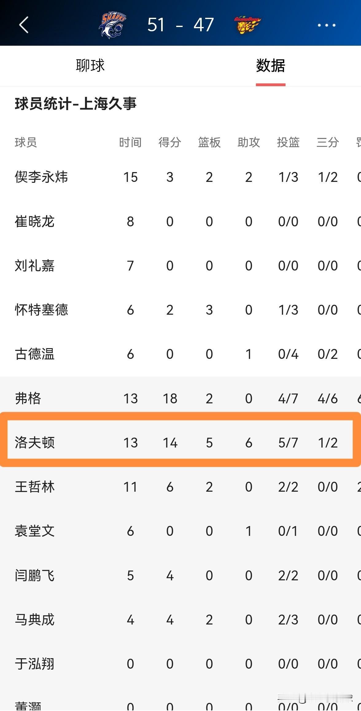 上海久事大杀器洛夫顿真是嚣张了!在今天进行的上海久事和广东东阳光的CBA俱乐部杯1/4决赛中,目前双方的上半场比赛已经结束,上海久事在主场以51:47领先对手。在前两节比赛中,洛夫顿在进攻端真是予取予求、无可阻挡,他在替补出战的13分钟里,投篮7中5,其中三分球2中1、罚球3中3轻松砍下14分,还有5篮板6助攻1抢断,他的场上正负值为+12。 由于广东东阳光的内线实力过于羸弱,因此洛夫顿打出了非常嚣张的表现。