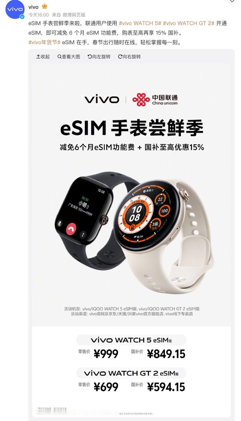 【vivo 联合中国联通推出“eSIM 手表尝鲜季”活动:WATCH 5/GT 2 开通可减免 6 个月功能费】