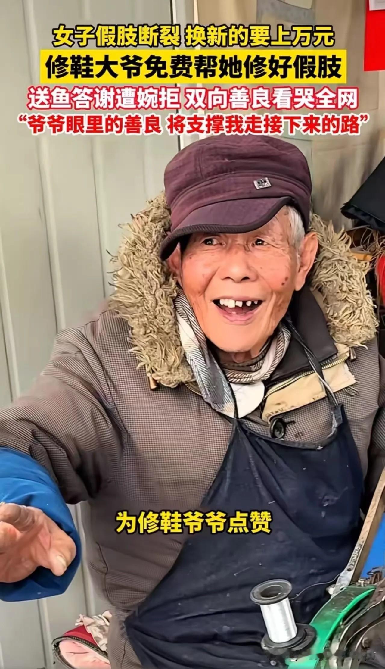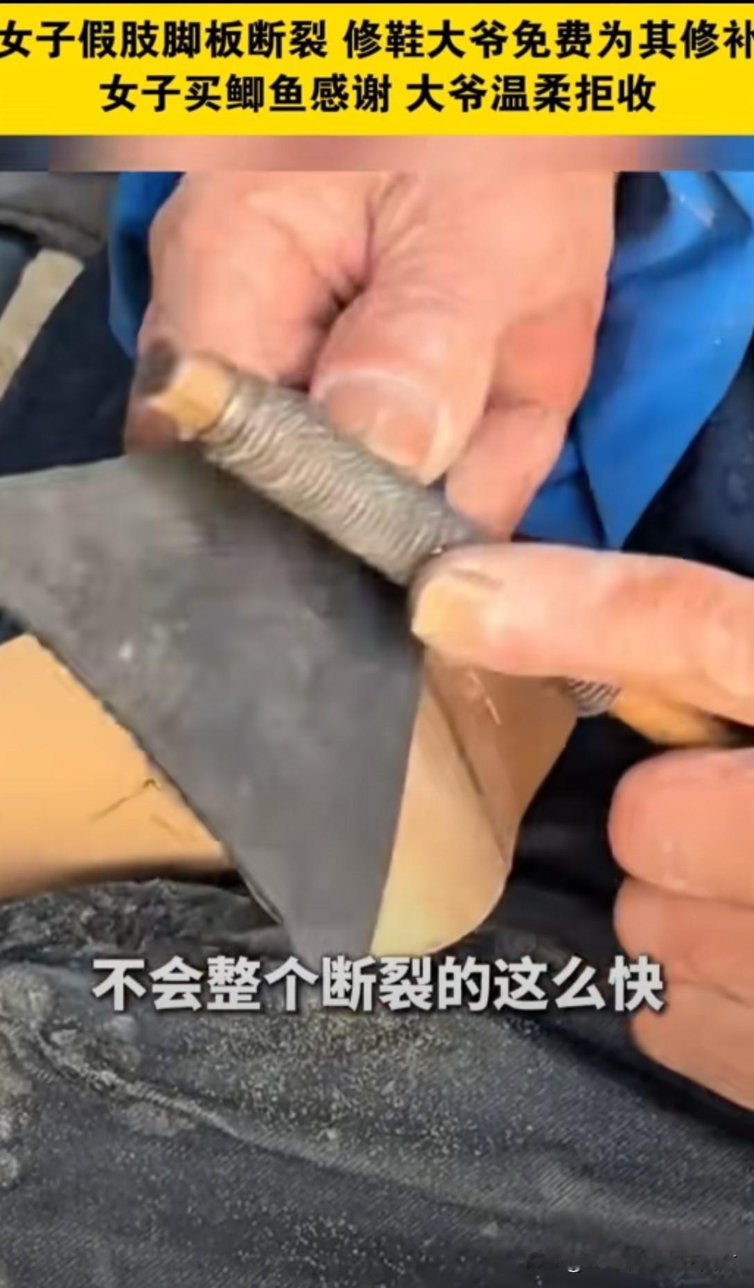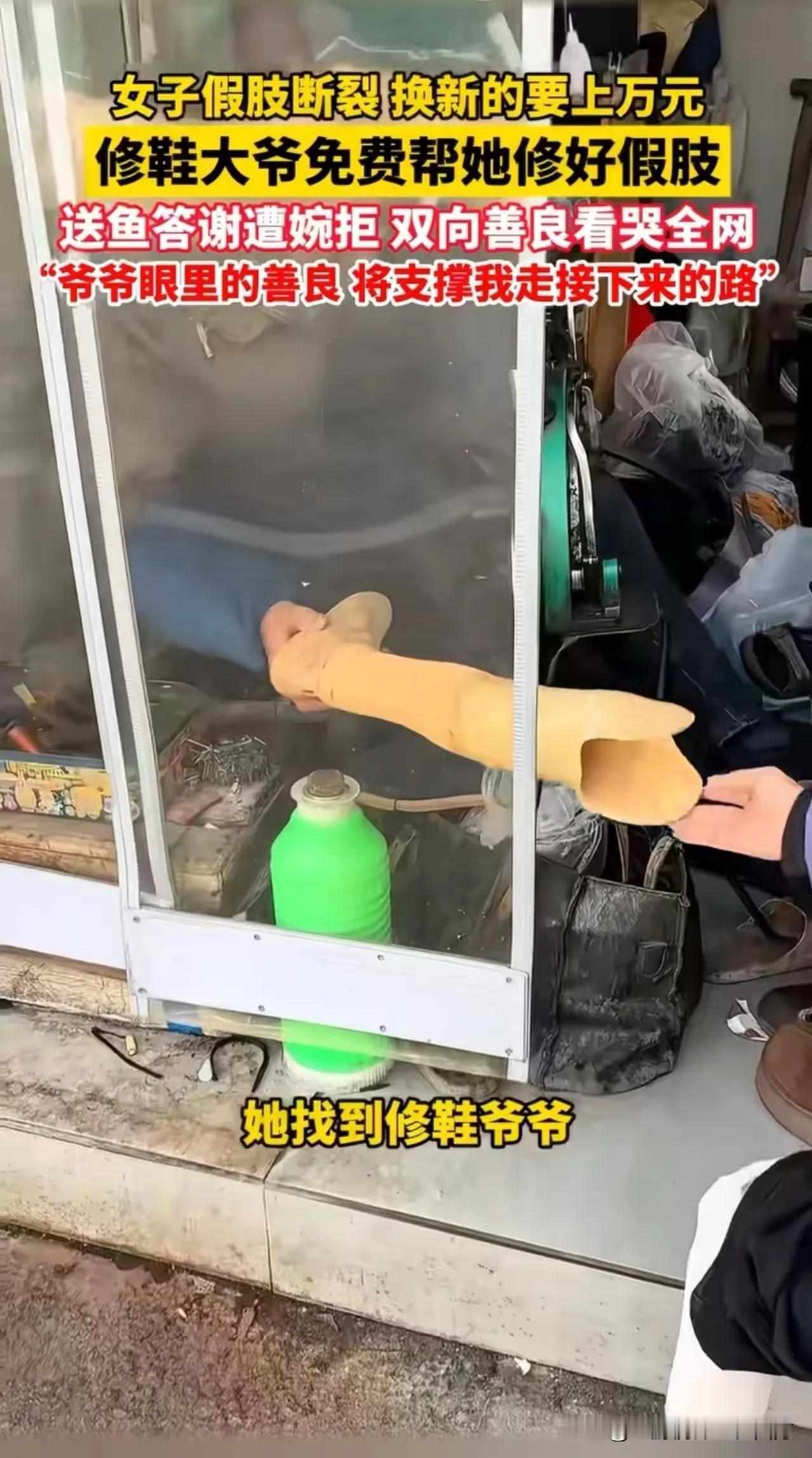 暖心:一瓶修鞋胶水抵价一万二千!!! 无锡一女子假肢断裂,换新需一万二,拮据之下求助修鞋大爷。大爷从未修过假肢,但见女子窘迫模样,心软应下“我试试”。 他凭着手艺细心涂胶、打磨、加固,愣是将假肢修得结实耐用。女子欣喜问价,大爷却分文不收,直言她更不容易,能帮一把是一把。女子买鱼致谢,也被大爷婉拒。 几毛钱的修鞋胶水,替女子省下上万开销,更粘住了最纯粹的人间善意。大爷修的是假肢,更是生活的支点,这份市井里的温暖,在浮躁时光里格外动人。