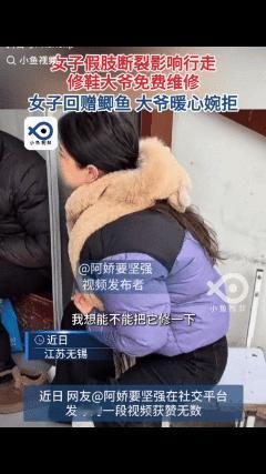 破防了!江苏无锡,一女子假肢断裂换新要上万块,正在发愁时,看见路边有修鞋大爷,试着问了一下能不能修,但是修鞋大爷说没修过,但可以试试,谁知,大爷不但修好了,还不要钱,接下来二人的。举动令人动容! 近日的梅村老街,靠假肢行走的刘女士正像往常一样出门,脚下却突然传来脆响——假肢的脚底板毫无征兆地断裂,瞬间让她行走困难,小腿处还因假肢晃动隐隐作痛。她心里一沉,打听后才知道现在的行情更换这处假肢组件竟要花上万元,犯了难的她抱着死马当活马医的心思,拖着断裂的假肢,慢慢走到了老街口的便民修鞋点,谁也没想到,这一趟竟遇上了藏在市井里的温柔。 修鞋的大爷七十多岁,在老街修鞋三十多年,手上磨出了厚厚的老茧,手艺在周边街坊里出了名的好,待人也总是和和气气的。接过刘女士的假肢,大爷先是愣了愣,坦言自己修了一辈子鞋,从没碰过假肢这东西,换做旁人或许就婉拒了,可当他看到刘女士费力取下假肢时的模样,又瞧着那断裂的接口,沉默片刻后还是摆了摆手:“我试试吧,总能给你弄结实了。”就这一句话,瞬间让人觉得心里暖暖的。 大爷戴上老花镜,把假肢放在腿上细细研究,从磨得发亮的工具箱里翻出特制强力胶、砂纸和防滑橡胶垫,便开始埋头忙活,那认真的模样,仿佛手里捧着的是什么珍宝。他先把断裂处的毛刺一点点打磨平整,生怕粗糙的边缘磨伤刘女士本就不易的小腿,再一层一层仔细涂胶,涂完一遍静静晾透,反复三次才肯罢休,做事的细致劲儿真的让人佩服;接着裁剪出一块大小合适的防滑橡胶垫,牢牢钉在假肢脚底,还念叨着“加这个走路稳,不容易摔”,处处都替别人着想;最后又用结实的尼龙线,把假肢上松了的绑带细细缝紧,每一针都拉得笔直,半点不含糊。阳光落在大爷花白的头发上,他专注的模样,让一旁的刘女士心里暖烘烘的,眼眶都忍不住发热。 半个多小时后,大爷把修好的假肢递给刘女士,笑着让她试试。刘女士装上假肢慢慢走了几步,脚下稳稳当当,断裂的地方被修补得严丝合缝,还多了层防滑垫,比之前用着还顺手,悬着的心一下子落了地。她满心感激,连忙掏钱要付维修费,可大爷却把她的手推了回去,语气干脆:“不要钱,这不算正经修鞋,就是搭把手的事,收什么钱。”朴实的话语,藏着最纯粹的善意。 刘女士实在过意不去,觉得受之有愧,转身就往附近的菜市场跑,挑了一条活蹦乱跳的大鲫鱼,用塑料袋装着赶紧送回来,硬塞到大爷手边:“大爷,您不收钱,这条鱼您一定拿着,新鲜的,熬汤补补身子!”这是她能拿出的最朴素也最真诚的心意,礼轻但情意重。可大爷依旧笑着婉拒,那双摆弄胶水和针线几十年、磨出老茧的手,轻轻却坚定地把鱼推了回去:“姑娘,你的心意我领了,鱼你拿回去自己吃,你走路不方便,别再为这点事跑一趟了。”大爷的拒绝,不是客套,而是刻在骨子里的体恤,知道对方的不易,便连这点回报都不肯收。 无奈之下,刘女士只好把鱼带回了家,她将这段经历拍成视频发布到网上,视频里大爷埋头修补假肢的模样、推拒鲫鱼的温柔,瞬间戳中了无数网友,短短时间就收获了满屏点赞,大家都被这市井里的温暖打动了。 💬 讲真的,看完这个故事,心里又暖又酸!大爷修的是假肢,可暖的是人心啊,三十多年的手艺,不仅补好了断裂的假肢,更补了刘女士此刻的窘迫。他不是不缺钱,七十多岁还在老街摆摊讨生活,风吹日晒的不容易,可在别人有难时,却把“搭把手”看得比钱重;刘女士也格外懂事,懂得感恩,一句感谢、一条鲫鱼,是她能拿出的全部心意,双向的善意才更让人动容。 网友说“一万块解决不了的事,大爷几块钱的材料就搞定了”,这话里藏着的,不仅是大爷精湛的手艺,更是最珍贵的良心和善良。愿这份老街里的温暖能一直传递,愿每个身处难处的人,都能遇到这样的善意,也愿我们都能成为别人生命里,那束小小的光,用一点点举手之劳,温暖身边的人。 无锡修鞋大爷的暖心善意 假肢缝补的人间温柔 梅村老街的温暖