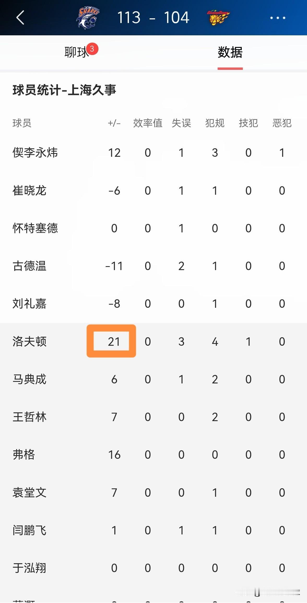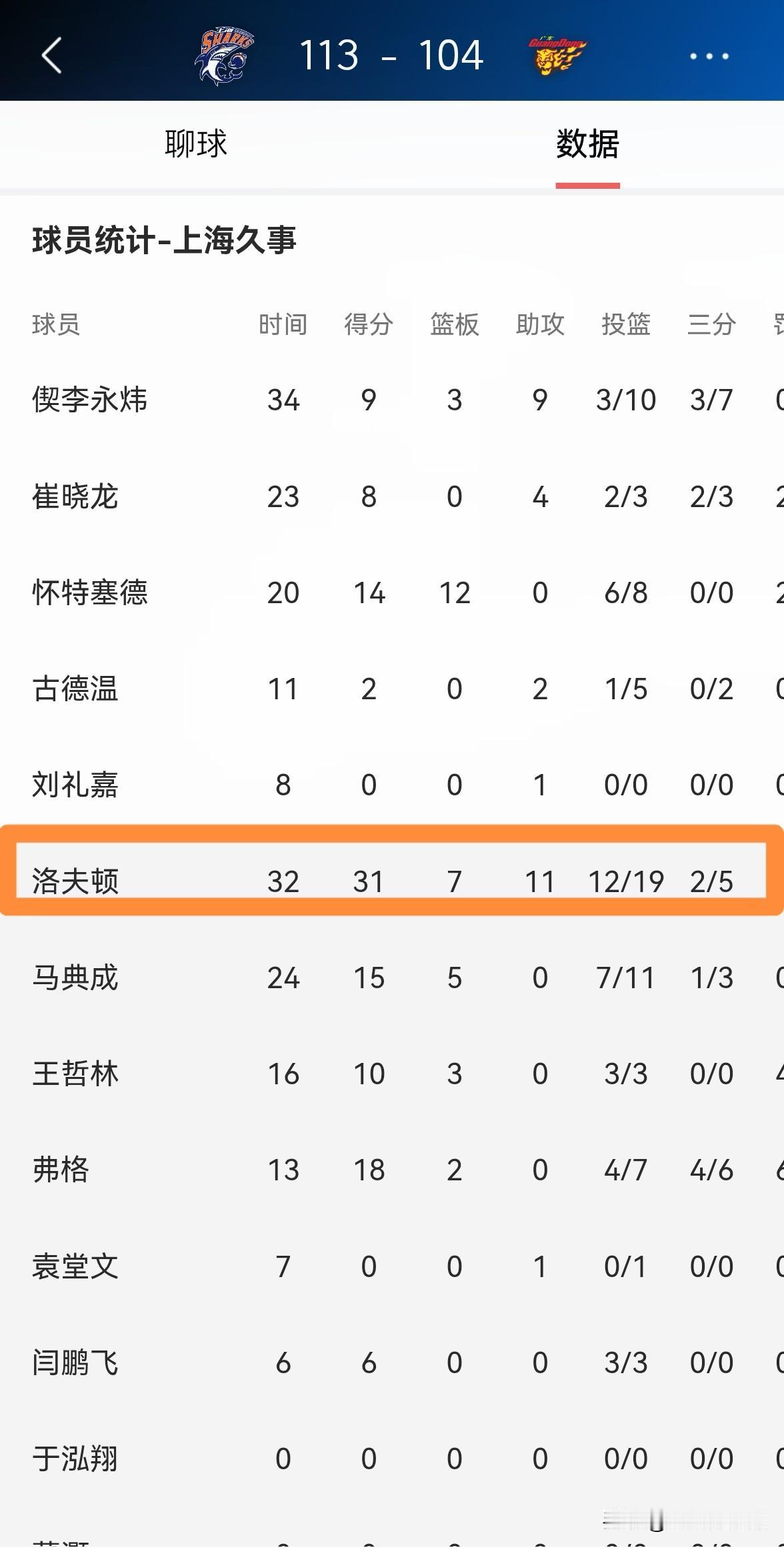 上海久事外援洛夫顿真是太屈才了!今天上海久事在主场以113:104轻取广东东阳光,顺利晋级CBA俱乐部杯的半决赛。值得一提的是,本场比赛洛夫顿在攻防两端都打出了极具说服力的表现,他在替补出战的32分钟里,投篮19中12,其中三分球5中2、罚球6中5轰下31分,外加7篮板11助攻1抢断1盖帽,他的场上正负值为球队最高的+21。 实事求是的说,以洛夫顿的能力来看,他在CBA的赛场上完全是降维打击,他应该趁早重返NBA才对,他在CBA打球真是太屈才了。