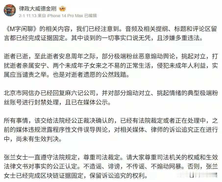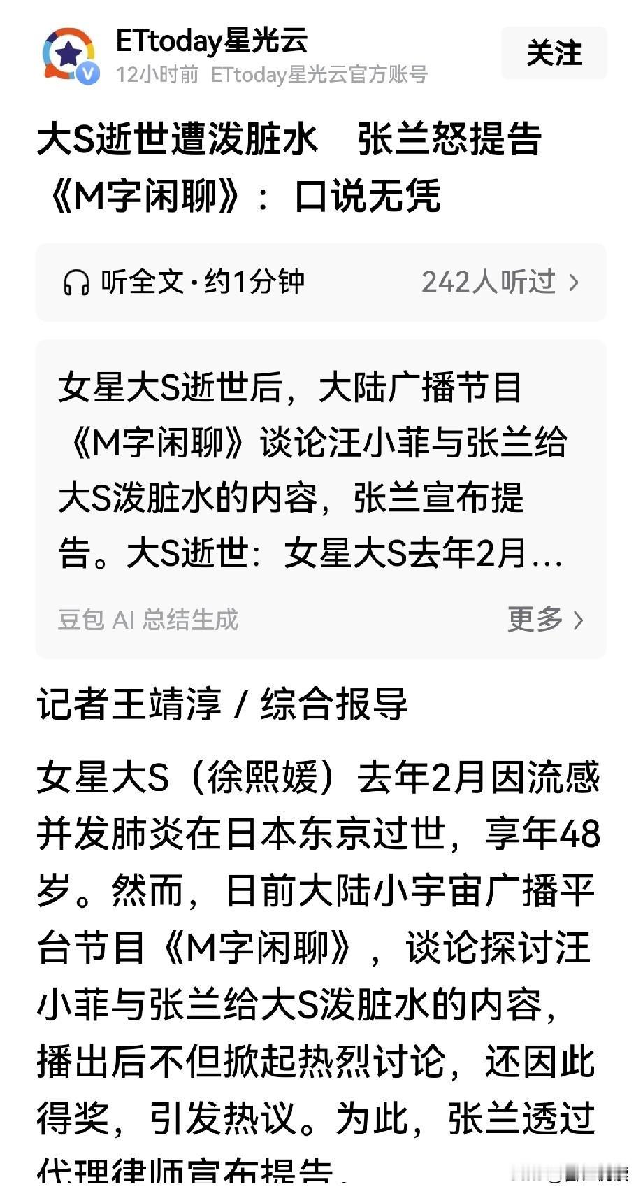 大家发现了吗 汪徐两家的恩怨情仇真像一个圈 之前是战兰在网上各种说说说 说前儿媳如何如何不好 直播时各种内涵模仿 前儿媳和她的现任 甚至一度还说 她的现任对小孙女怎么样 大S提出过反击并说在用法法 试图去约束战兰泼脏水的言行 哪想如今风水轮流转了 据说有个叫M闲聊的节目 做了一期汪家母子 对大S泼脏水的反击 结果战兰及律师不愿意了 说对方口说无凭要提起法法诉讼 想当年她在网上内涵明涵前儿媳时 明明也是一张嘴一碰一合 也没给网友摆出过 什么实质性证据 怎么现在有人对她反击了 她张口就说对方口说无凭了呢 感情有些事她说得 别人说不得