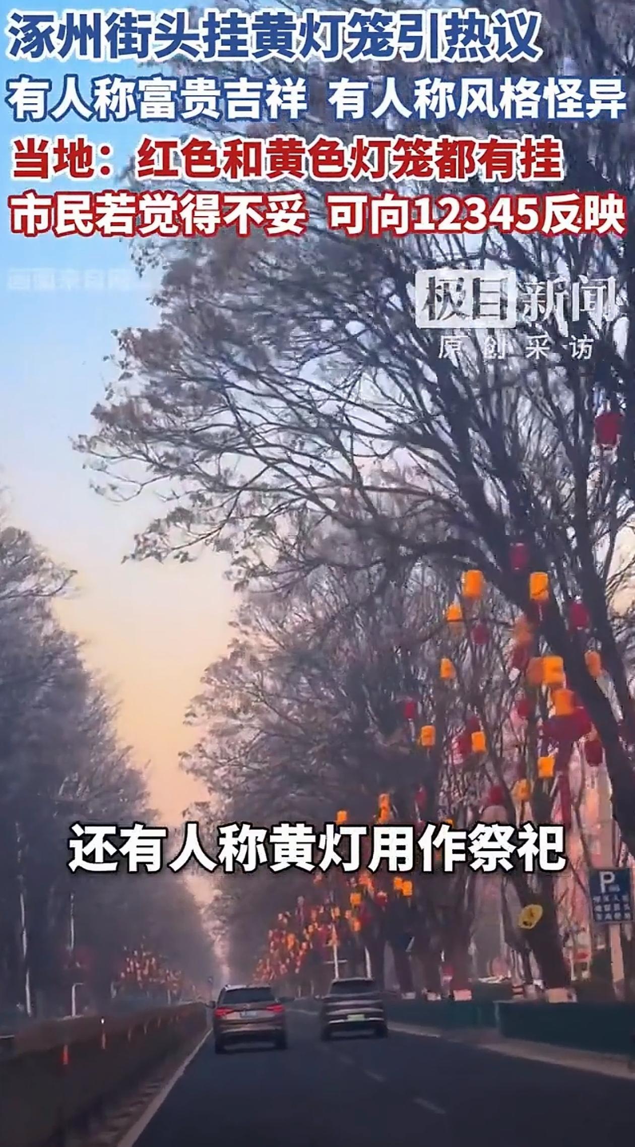 河北涿州一男子开车出门,发现街上两边挂满了灯笼,可他左看右看,总觉得这灯笼颜色有点怪怪的,原来涿州挂的竟然是黄灯笼!当地:“除了黄的也有挂着红的。” 没想到啊,一个小小的灯笼也能闹出这么大的争议。 据涿州当地的工作人员解释,他们是看年关将近,所以特意挂上灯笼来增添一些节日气氛。 男子提到的黄色灯笼主要挂在鼓楼那个区域,因为觉得黄颜色比较隆重,很配那一片古色古香的样子。 而其他的行车街道并不只是挂了黄灯笼,同样也挂了大家都比较喜欢,接受度较高的红色灯笼。其实远远看去,红色和黄色相映成趣,颇有一番景致。 但网友们看完后意见不一,有人觉得这个解释就是有点扯,那照这么说挂白的是不是也有纯洁的意思?也有人觉得黄灯笼代表富贵吉祥,挂着没什么问题。 可以理解为了营造不一样的节日气氛,所以在灯笼颜色的选择上别出心裁,用黄颜色的灯笼来实现另样的搭配。 但也得考虑到,毕竟在我们的传统文化里,过年基本上都是挂大红灯笼的,虽然挂黄灯笼不失为一种巧思,但对于普通人而言,接受度或许没有那么高,反而显得不伦不类。