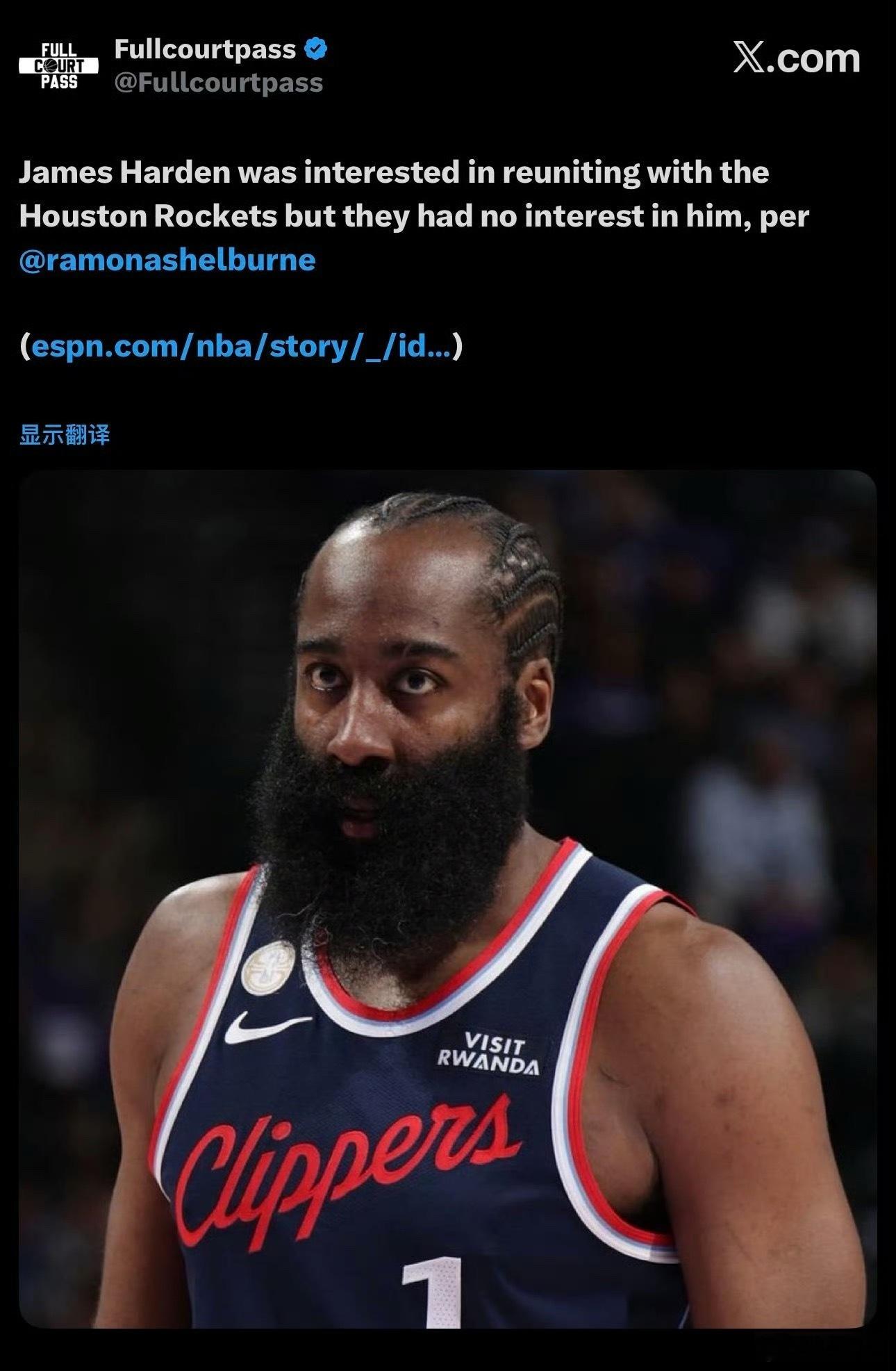 ESPN:詹姆斯·哈登有意重返休斯顿火箭队,但火箭队对他没有兴趣。