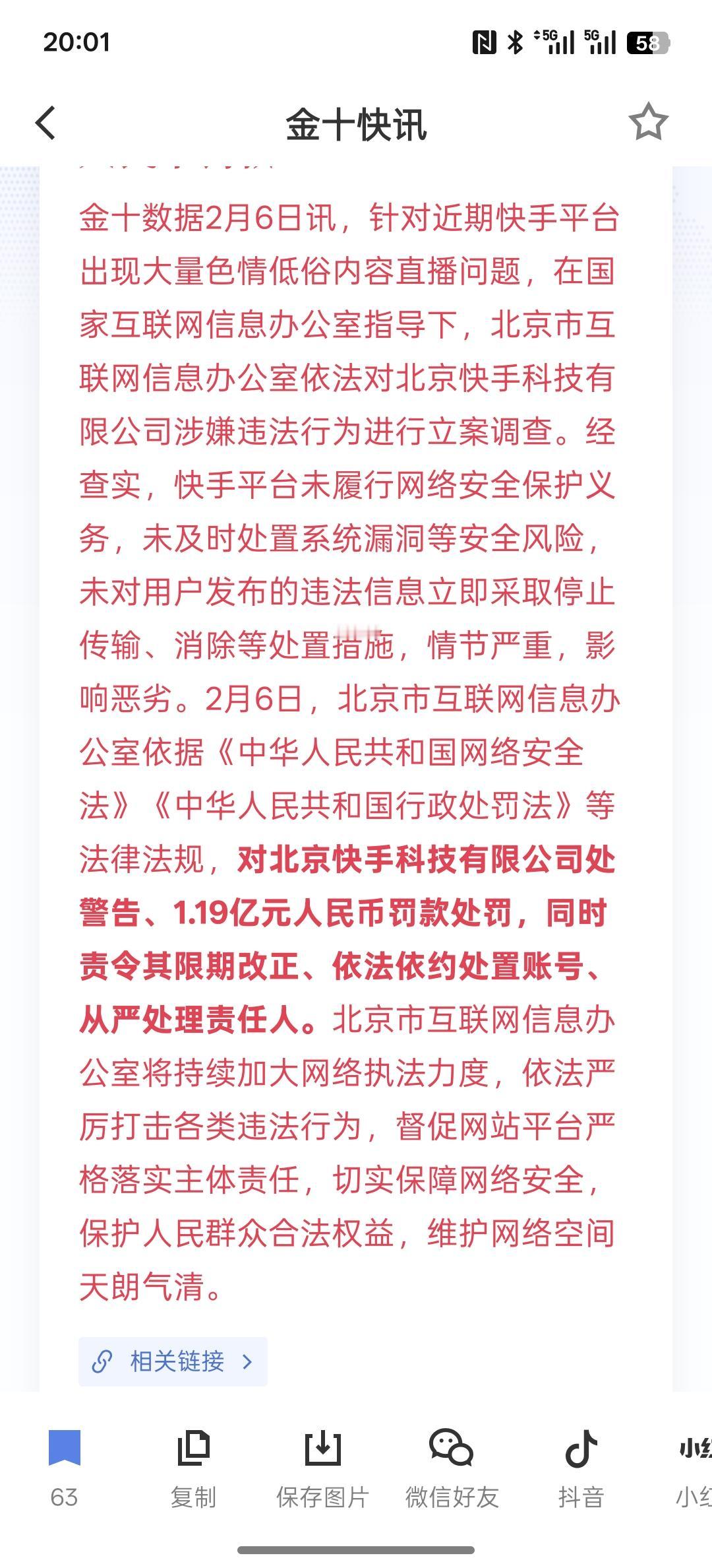 对平台出手了,网信部门对快手处以1.19亿元人民币罚款,是对于责任人要严肃处理,是直播这个行业出现很多低俗色情的直播,平台就是有责任,要落实到责任人,不能让这样的事情持续发生。网络平台的漏洞要进行技术管理! 记得前段时间,快手被相关网络攻击过后,出现了大量的色情直播!现在对快手的罚款,也就是在告诫其他平台不要有类似的问题发生!