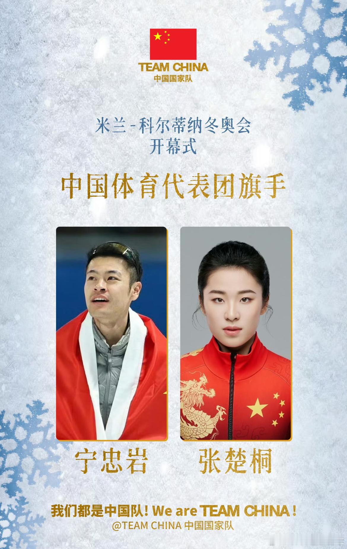 米兰冬奥会明天开幕米兰冬奥会已经准备就绪,北京时间7号凌晨3点开幕!中国体育由宁忠岩和张楚童带领126名中国队员入场!中国队参加7个大项15个分项91个小项的比赛!请为我们的中国队员高喊:中国队加油!