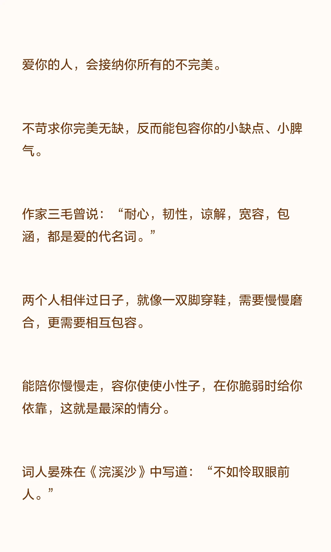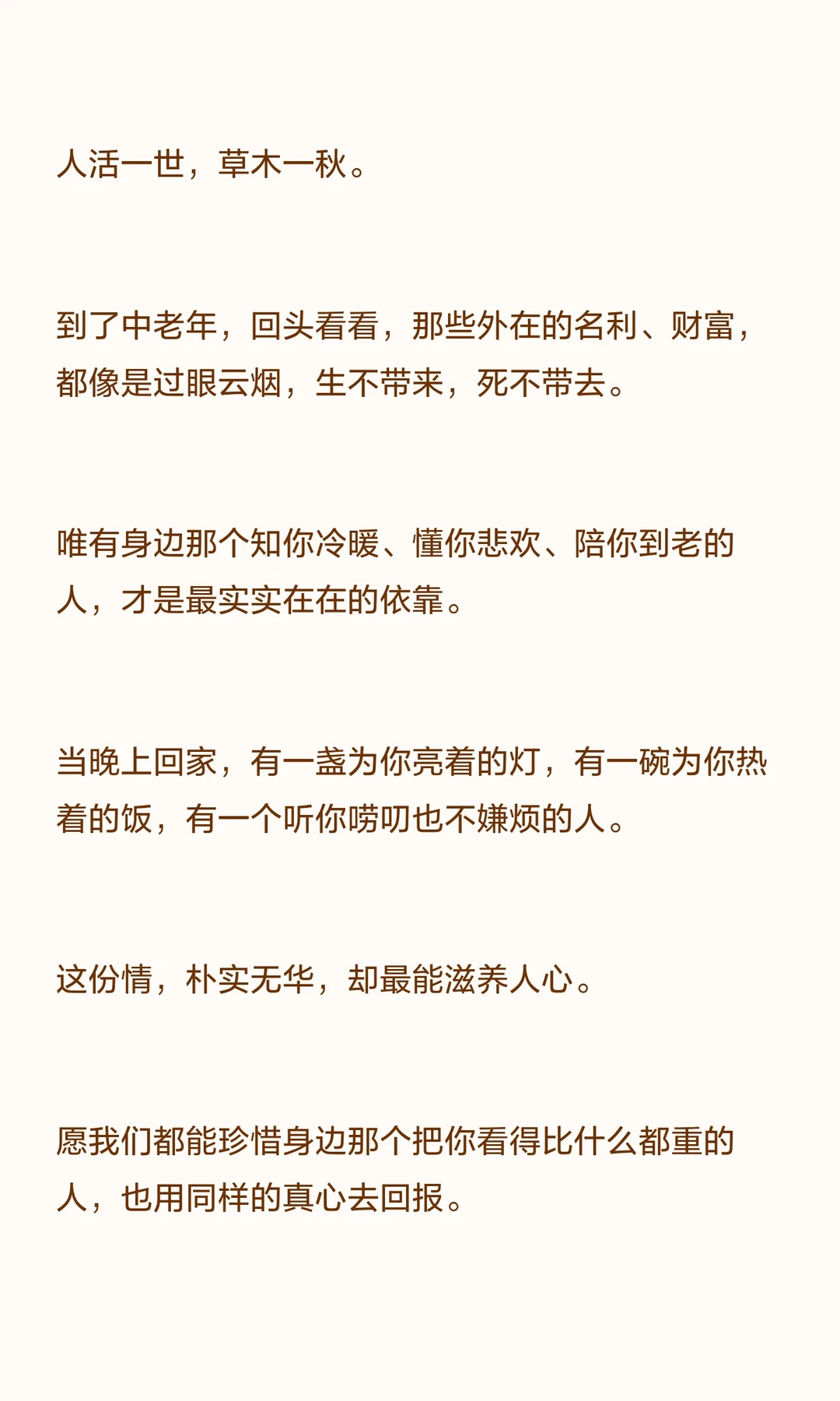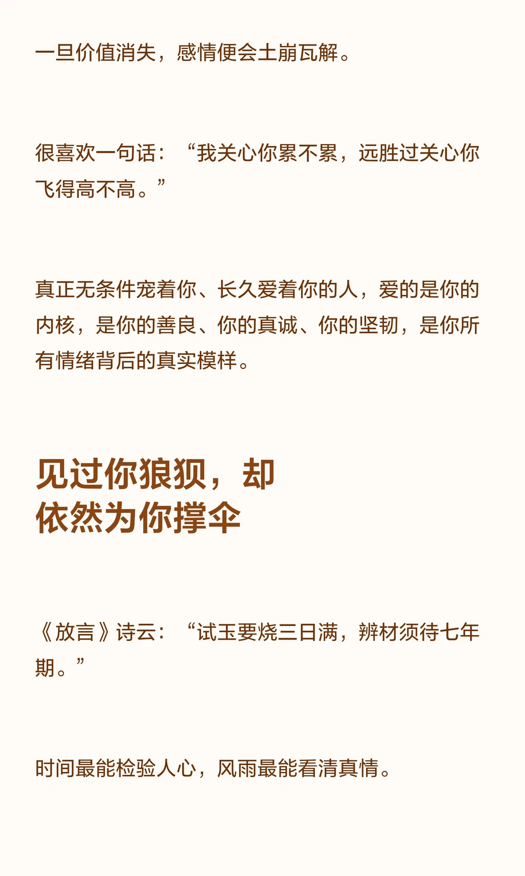 感情中,真正爱你的人,会关注你的内心,而非外在条件。 他们会在你最狼狈时依然陪伴,理解你的感受,接纳你的不完美。 珍惜那些在你脆弱时伸出援手,陪你走过风雨的人,用真心回报他们的偏爱,让平淡生活充满温暖。