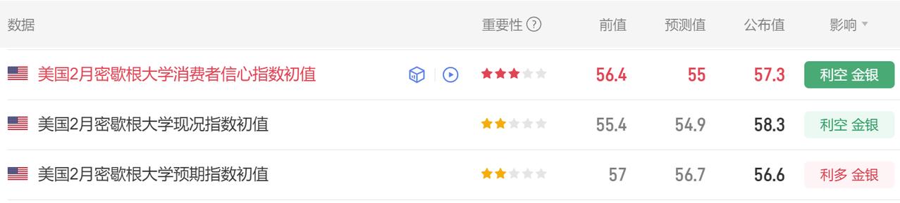 黄金和白银是否还有上涨空间呢? 今晚多项经济数据公布。 首先美国2月密歇根大学消费者 信心指数初值 57.3,市场预期55,前期数值56.4。 其次美国2月密歇根大学现况指数初值 58.3, 市场预期54.9,前期数值55.4。 最后美国2月密歇根大学 预期指数初值 56.6,市场预期56.7,前值57。 这几项数据,有两项利空金价, 一项经济数据利多金价, 数据公布,国际金价冲高减弱,震荡运行!