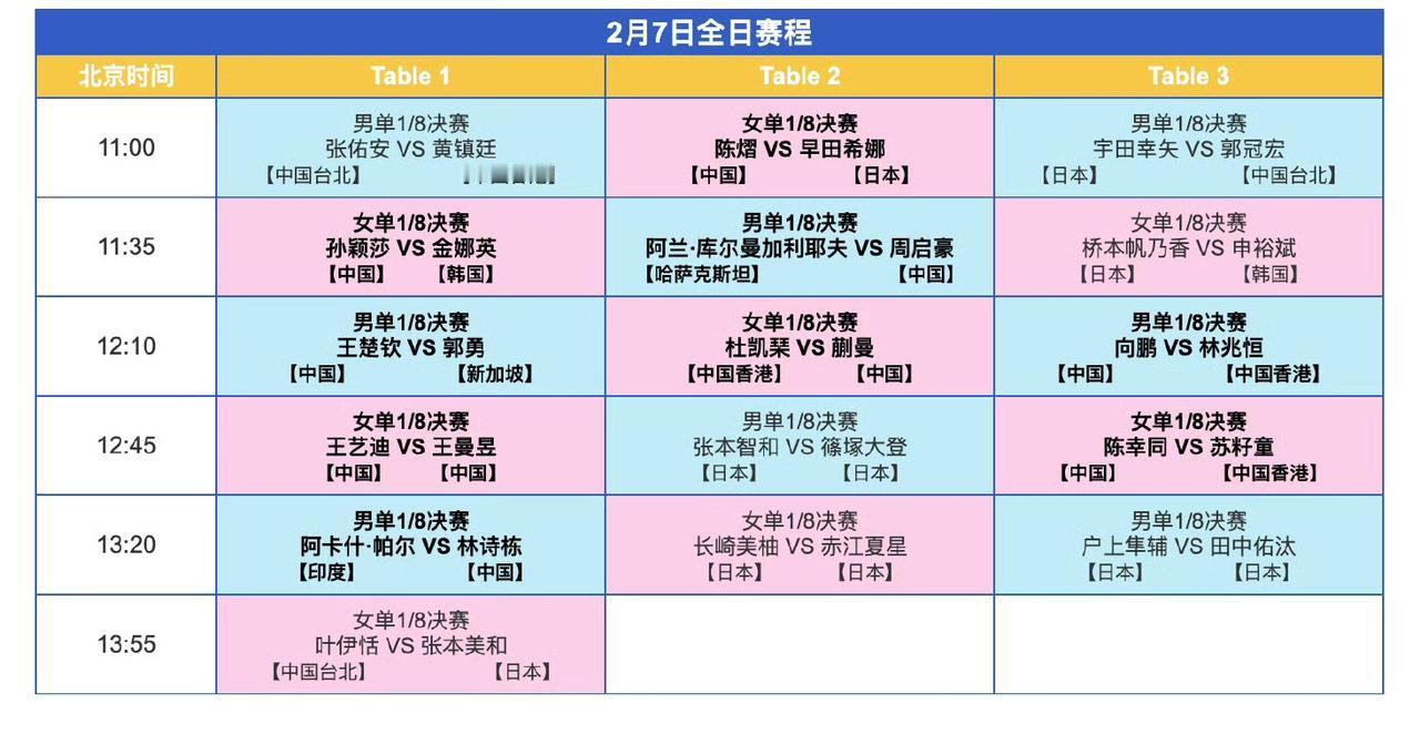 明日(2月7日,周六)赛程! 2026第35届海口亚洲杯2月7日全日赛程如图所示。 中午是1/8决赛,晚上还有1/4决赛[笑哭]。 这赛程对中国队球迷来说太好了,国乒的所有比赛都安排在了白天。 从上午十一点开始,打到下午一点多,不过三张台子同时开打,有时候同一时间就有两三场比赛需要看,有点儿太紧张了[捂脸]。 明天的焦点战应该是陈熠🇨🇳VS早田希娜🇯🇵,以及中午一点左右开始的王艺迪🇨🇳VS王曼昱🇨🇳的比赛。 明天一起观赛,不见不散哦[笑哭]!