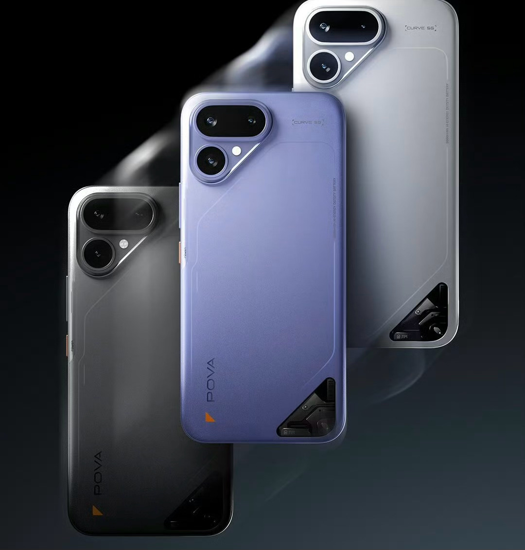 Pova Curve 2新机正面6.78英寸,1.5K双曲屏,背部三角三摄镜组,右下角还加入了透明设计