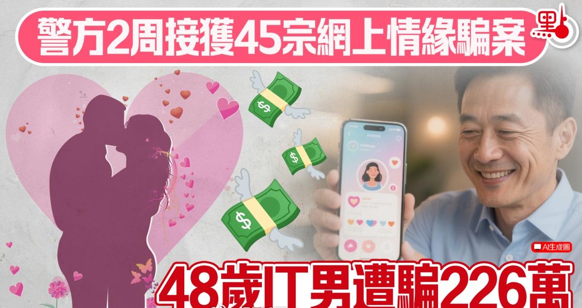 【警方2周接获45宗网上情缘骗案 48岁IT男遭骗226万】警方4日于社交专页发文称,在过去的2周内,接获了45宗网上情缘骗案,涉款4,300万元。其中一名48岁从事电脑行业的男子,早前在社交平台Instagram收到骗徒讯息,交谈约一个月后双方发展网恋,最终被骗走共226万元。 警方提醒市民,对“白撞”讯息要保持警惕,特别是网恋数日对方即表达爱意,或用“BB猪”等过度亲昵称呼博取信任,但提出见面时,对方却多番推搪,并游说投资USDT或比特币等产品。警方指出,此类模式属网上爱情骗案的典型手法,听到对方提及有高回报投资就要提高警觉。网页链接