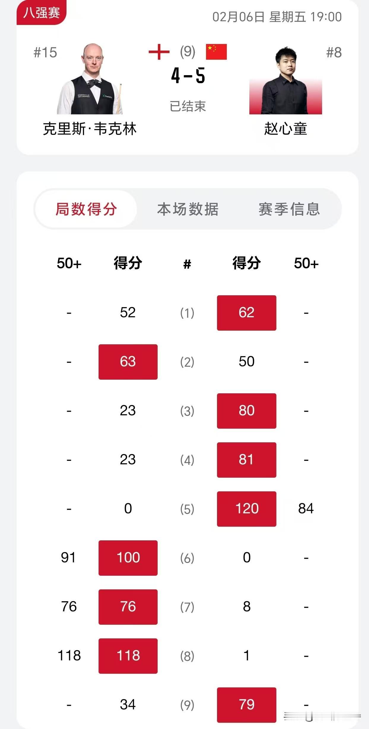 斯诺克香港大奖赛,中国选手历史性的包揽排名赛4强。 结果是好的,过程却很艰难。 赵心童和韦克林失误都很多,但是赵心童上手能力确实强,取得了4-1的领先优势,韦克林突然发力,连续打出单杆70+以上一杆致胜,比赛进入了决胜局。 决胜局赵心童认真起来,非常专注。不断打进高难度进球,一举超19分,但是韦克林并没有放弃,通过高质量的斯诺克,让赵心童没解到而且送了一个自由球。一下子变成仅仅超4分,形势变得严峻。好在赵心童利用准度打进红球,黄球等,最终5-4获胜。 周跃龙上半场取得了3-1的领先,下半场机长卡特连赢3局,比分变成3-4,最后两局,曾经的玻璃心周跃龙小宇宙爆发,连续一杆致胜,5-4淘汰了卡特。 中国4名选手,赵心童,肖国栋,周跃龙,张安达会师4强。 明天下午1点,张安达对阵周跃龙 晚上7点,赵心童对阵肖国栋 赵心童今天比赛一直在咳嗽,感觉身体不适,明天恐怕难于抵御肖国栋。 张安达和周跃龙,周跃龙一冠难求,这一次是个好机会。