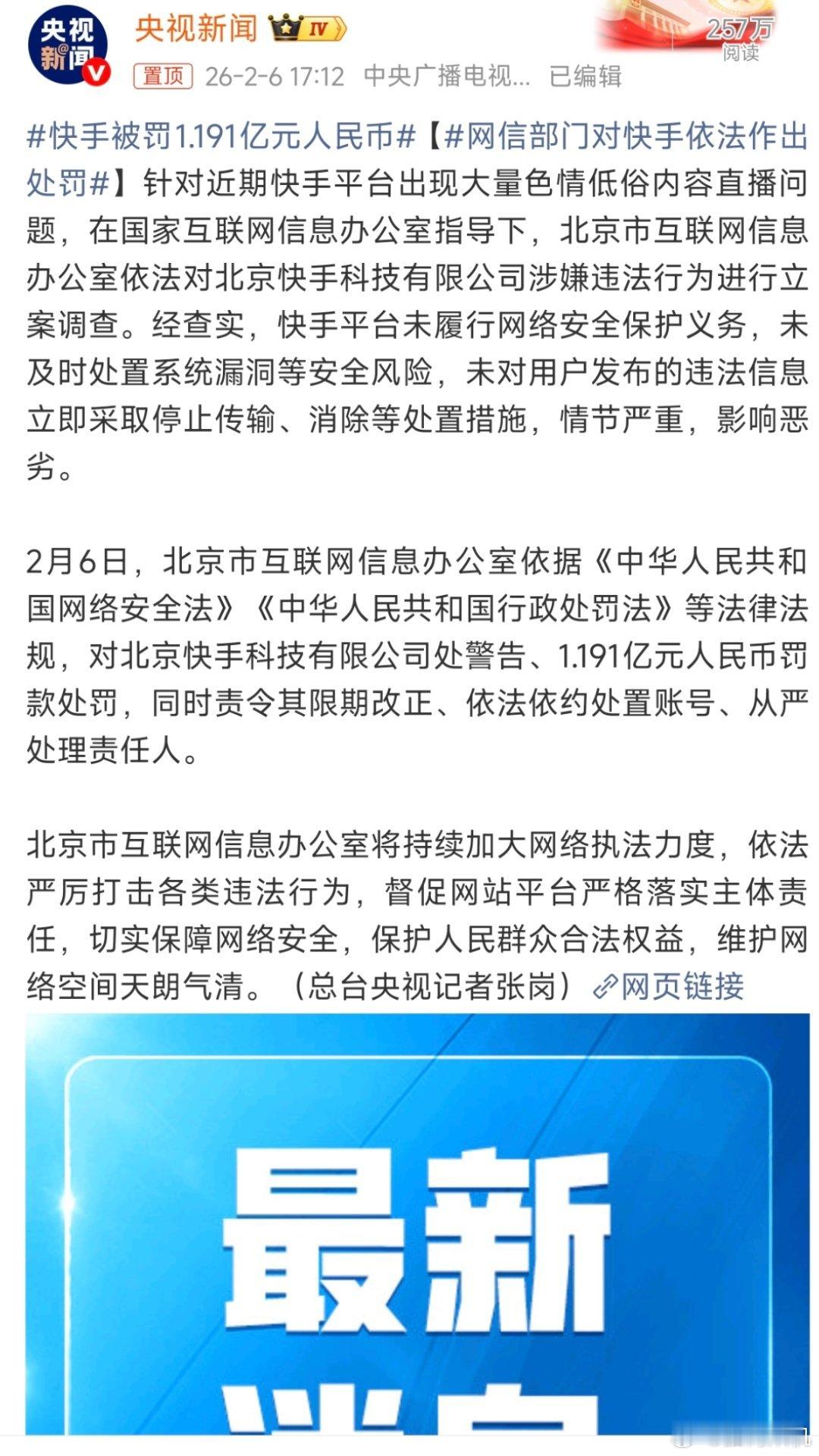 快手被罚1.191亿元人民币