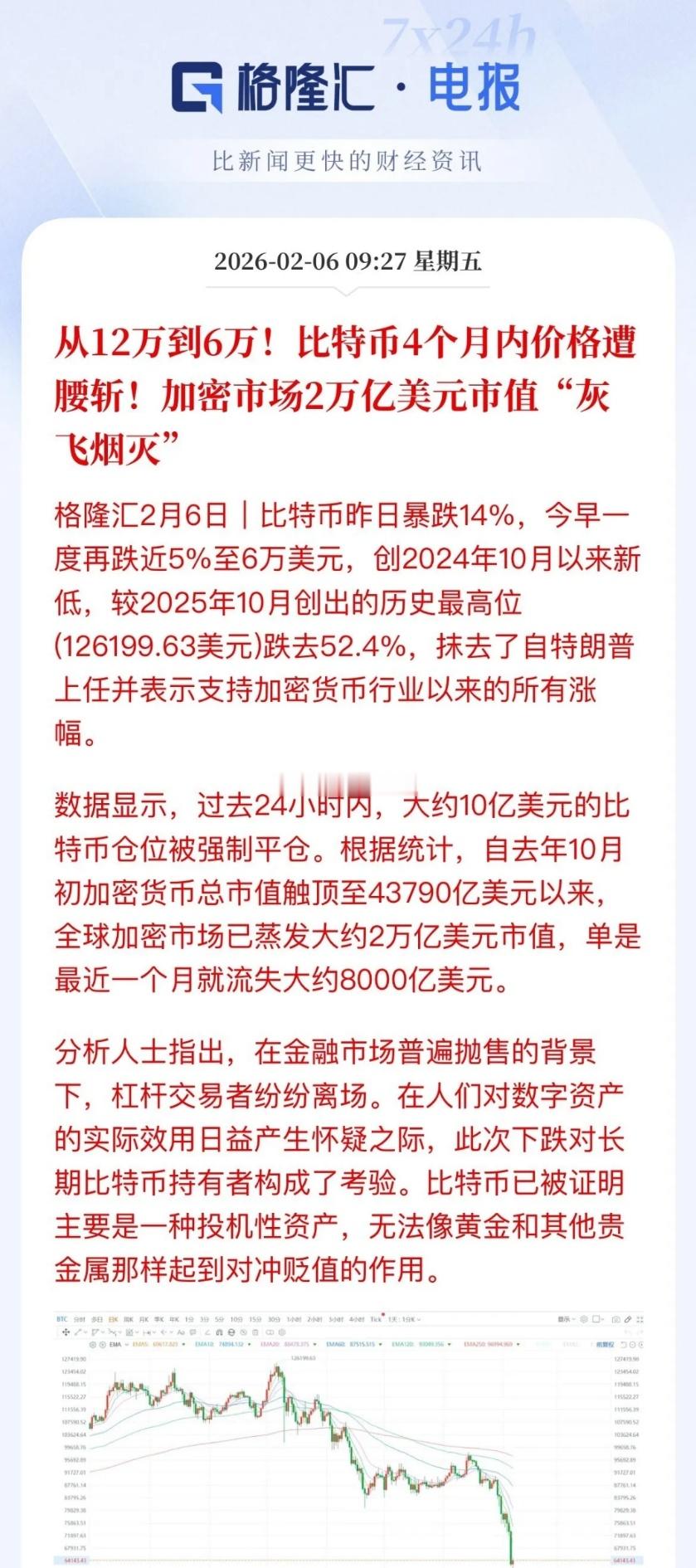 比特币=投机资产了?14万亿元市值灰飞烟灭,4个月时间,加密货币市场今天最低跌至6万美元,最高在2025年10月6日创下高点12.4万美元,从高点下来已经累计跌幅52%,腰斩了,这一波下来,多少投资者被动平仓和爆仓,一觉醒来,账户归于零了