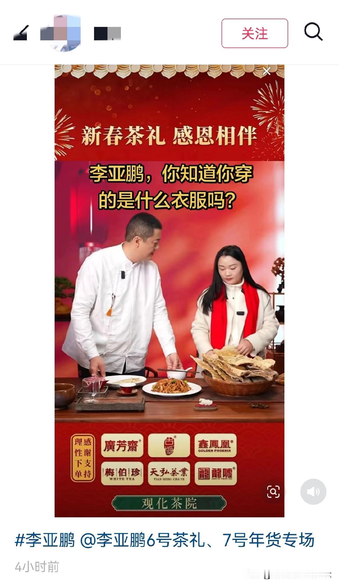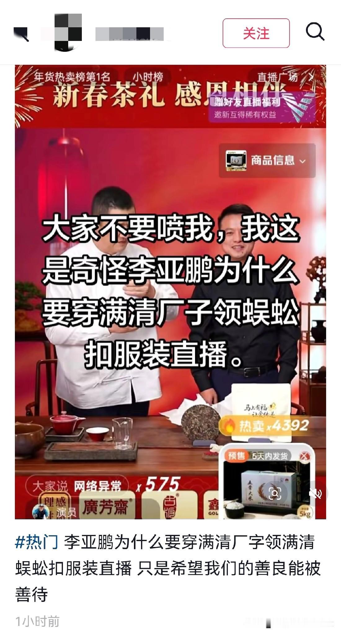 “李亚鹏,你知道你穿的是什么衣服吗?”李亚鹏时隔一周再开播,就有人拿他今天穿的衣服做文章。 人红是非多,李亚鹏今天开播,一连几个小时,直播间人数都稳定在十万+,稳居抖音年货榜一二名。 他现在的流量必然会引发别人的质疑和抹黑。我预料到有人会质疑他卖的茶不好,也预料到有人会说他在直播间演戏,但没想到开播才一小时,就有人拿他穿的衣服做文章。 有网友说他今天穿的衣服是“满清厂子领蜈蚣扣”,关于这种设计,我不是很懂,为什么会引发争议,于是我问了问豆包。 豆包给出的解释是——这是一件典型的新满式风格服装,而非传统汉服。它以清代服饰的厂字领和蜈蚣扣为核心元素,结合了现代剪裁,是当下直播带货等场景中常见的“中式”穿搭选择。 之所以引起争议,是因为有人认为厂字领和蜈蚣扣承载着“剃发易服”的历史记忆,但也有人认为这只不过是现代设计对传统元素的再创作,没必要过度解读。 在我看来,这不过是在直播茶叶这种特定的场景中的风格而已,为了体现中式儒雅的气氛,没有必要上纲上线。大家觉得呢? 李亚鹏