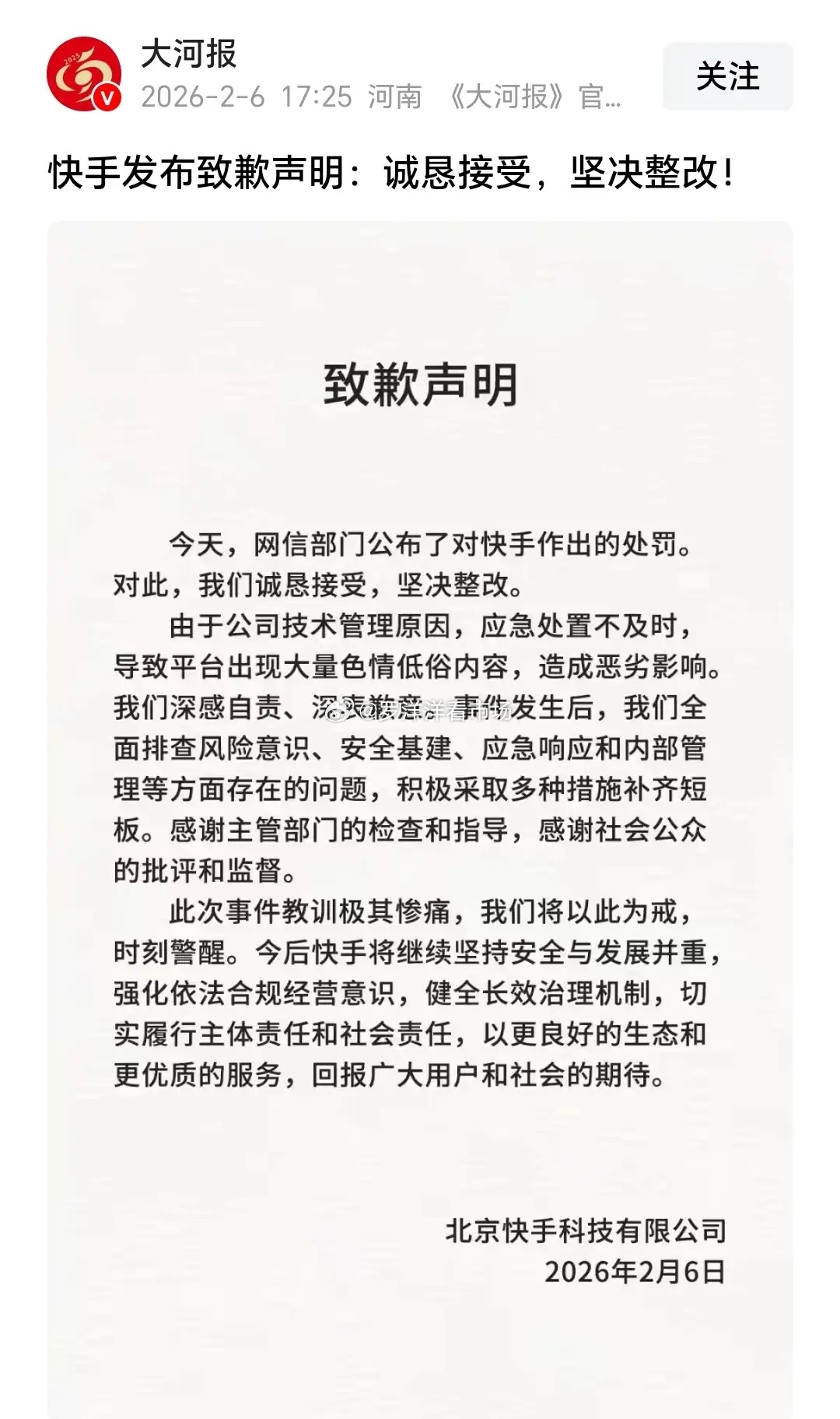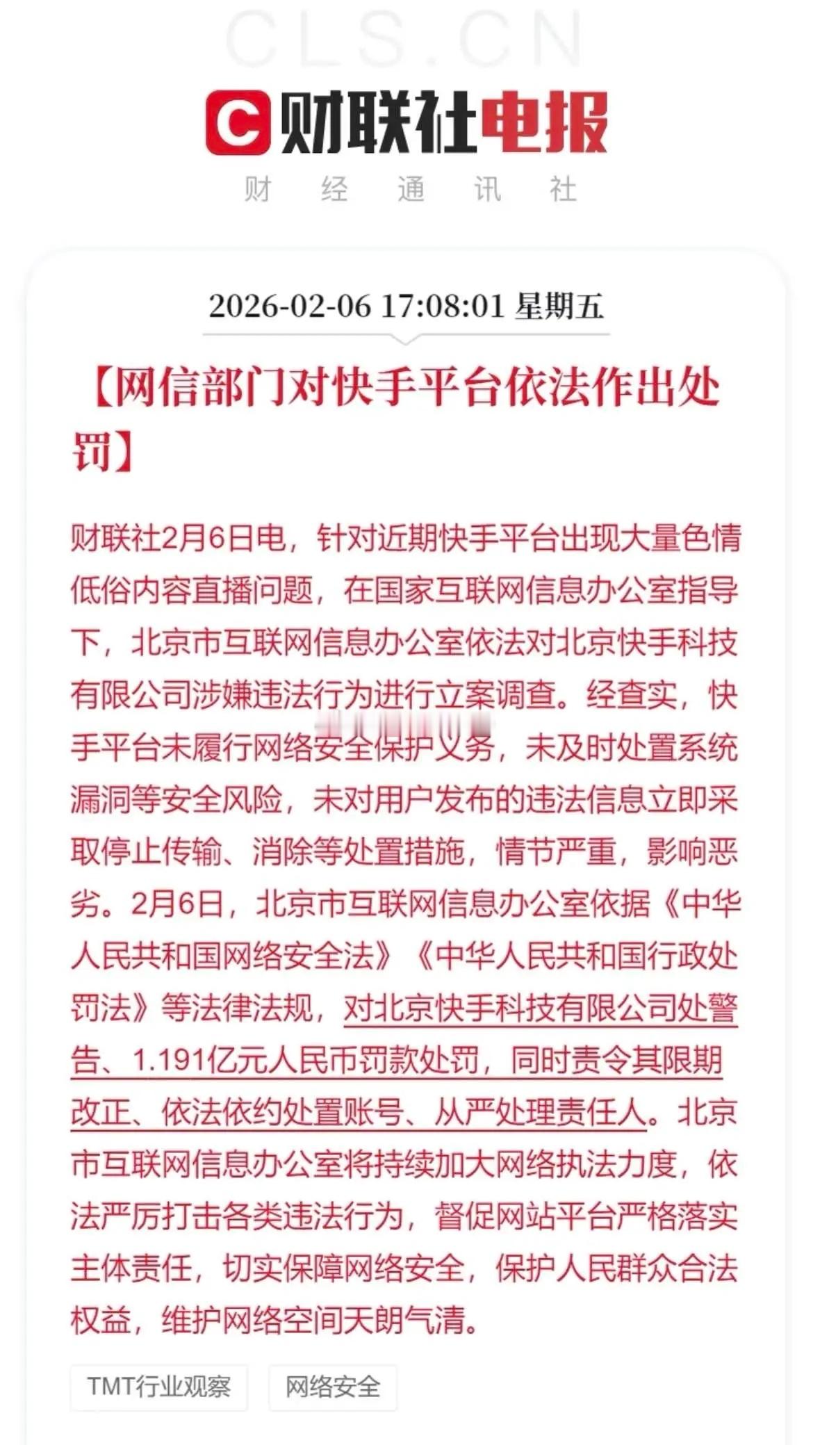 媒体报道,经调查发现,快手未能履行网络安全保护义务,未能及时处理系统漏洞,对违法信息也未及时处置,情节严重、影响恶劣。2月6日,依据相关法律法规,快手被予以警告并处以巨额罚款,同时还需限期改正、处置违规账号、处理相关责任人。