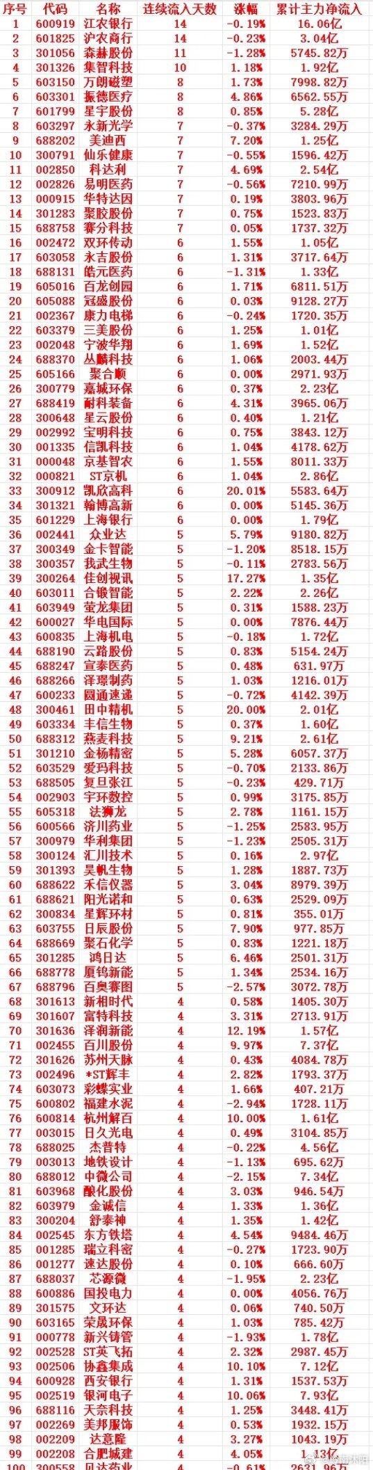 2月6日周五收盘主力资金布局梳理:多日连续净流入、低位大幅吸筹个股名单出炉1 600919 江农银行:14天连续流入,当日-0.19%,累计净流入16.06亿元2 601825 沪农商行:14天连续流入,当日-0.23%,累计净流入3.04亿元3 301056 森赫股份:11天连续流入,当日-1.28%,累计净流入5745.82万元4 301326 集智科技:10天连续流入,当日1.18%,累计净流入1.92亿元5 603150 万朗磁塑:8天连续流入,当日1.73%,累计净流入7998.82万元6 603301 振德医疗:8天连续流入,当日4.86%,累计净流入6562.55万元7 601799 星宇股份:8天连续流入,当日0.85%,累计净流入5.28亿元8 603297 永新光学:7天连续流入,当日-0.37%,累计净流入3284.29万元9 688202 美迪西:7天连续流入,当日7.20%,累计净流入1.25亿元10 300791 仙乐健康:7天连续流入,当日-0.55%,累计净流入1596.42万元11 002850 科达利:7天连续流入,当日4.69%,累计净流入2.54亿元12 002826 易明医药:7天连续流入,当日-0.56%,累计净流入7210.99万元13 000915 华特达因:7天连续流入,当日0.19%,累计净流入3803.96万元14 301283 聚胶股份:7天连续流入,当日0.75%,累计净流入1523.83万元15 688758 赛分科技:7天连续流入,当日0.05%,累计净流入1737.32万元银行板块成为主力资金长期布局的核心方向,江农银行、沪农商行以14天连续净流入位居榜单前列,其中江农银行16.06亿元的累计净流入额为所有标的最高,上海银行、西安银行也跻身资金连续流入阵营。值得注意的是,获主力持续加仓的银行股,短期股价均呈现微涨或微跌走势,典型的资金低位吸筹、股价横盘整理特征凸显。从整体布局特征来看,主力资金连续流入天数与个股股价涨幅并非呈正相关,多只标的出现资金持续进场但股价走弱的情况。例如森赫股份11天连续流入但当日股价下跌1.28%,皓元医药6天连续流入跌幅1.31%,百奥赛图5天连续流入跌幅2.57%,此类标的大概率处于主力低位吸筹阶段,资金布局的中长期意愿显著强于短期股价表现。资金流入与股价拉升形成共振的标的则集中在中小盘股,短期赚钱效应突出。凯欣高科6天连续流入累计涨幅20.01%,田中精机5天连续流入累计涨幅20.00%,佳创视讯5天连续流入累计涨幅17.27%,均为典型代表;泽润新能4天流入涨幅12.19%、杭州解百4天流入涨幅10.00%、银河电子4天流入涨幅10.06%,也属于资金与股价同步走高的类型。部分大市值标的及赛道龙头也获主力资金逆势布局,大额资金进场凸显对其长期价值的认可。中微公司4天连续净流入7.34亿元、百川股份4天连续净流入7.37亿元,尽管短期股价分别下跌2.15%、上涨9.97%,但大额资金的持续布局意图明确;汇川技术5天净流入2.97亿元、星宇股份8天净流入5.28亿元,作为各行业龙头标的,获资金长期布局的同时股价保持横盘或微涨,资金布局节奏偏稳健。此次主力资金流入规模分化特征显著,头部标的与尾部标的净流入额差距悬殊。除江农银行16.06亿元的巨额流入外,百川股份7.37亿元、中微公司7.34亿元、银河电子7.93亿元,位列4天流入规模前列;而宣泰医药5天流入仅631.97万元、星辉环材5天流入355.01万元、彩蝶实业4天流入407.21万元,小规模资金流入标的多为中小盘股,主力布局力度相对较弱。ST股及困境反转类标的也成为主力资金布局的细分方向,资金博弈重组、转型等预期特征明显。ST京机6天连续净流入2.86亿元,当日股价涨1.04%;*ST辉丰4天净流入1793.37万元,当日涨2.82%;ST英飞拓4天净流入2987.45万元,当日涨2.32%,这类存在业绩或经营风险的标的,获资金持续进场体现了市场对其后续基本面改善的期待。此外,主力资金布局并非集中于单一板块,医药、机械制造、环保等细分赛道的优质标的均获持续关注。医药板块的振德医疗、美迪西、我武生物,机械制造板块的合锻智能、宇环数控,环保板块的嘉城环保、荣晟环保,均实现5天及以上的资金连续净流入,反映出主力资金对各细分领域优质标的的深度挖掘,而非普涨式的板块布局。