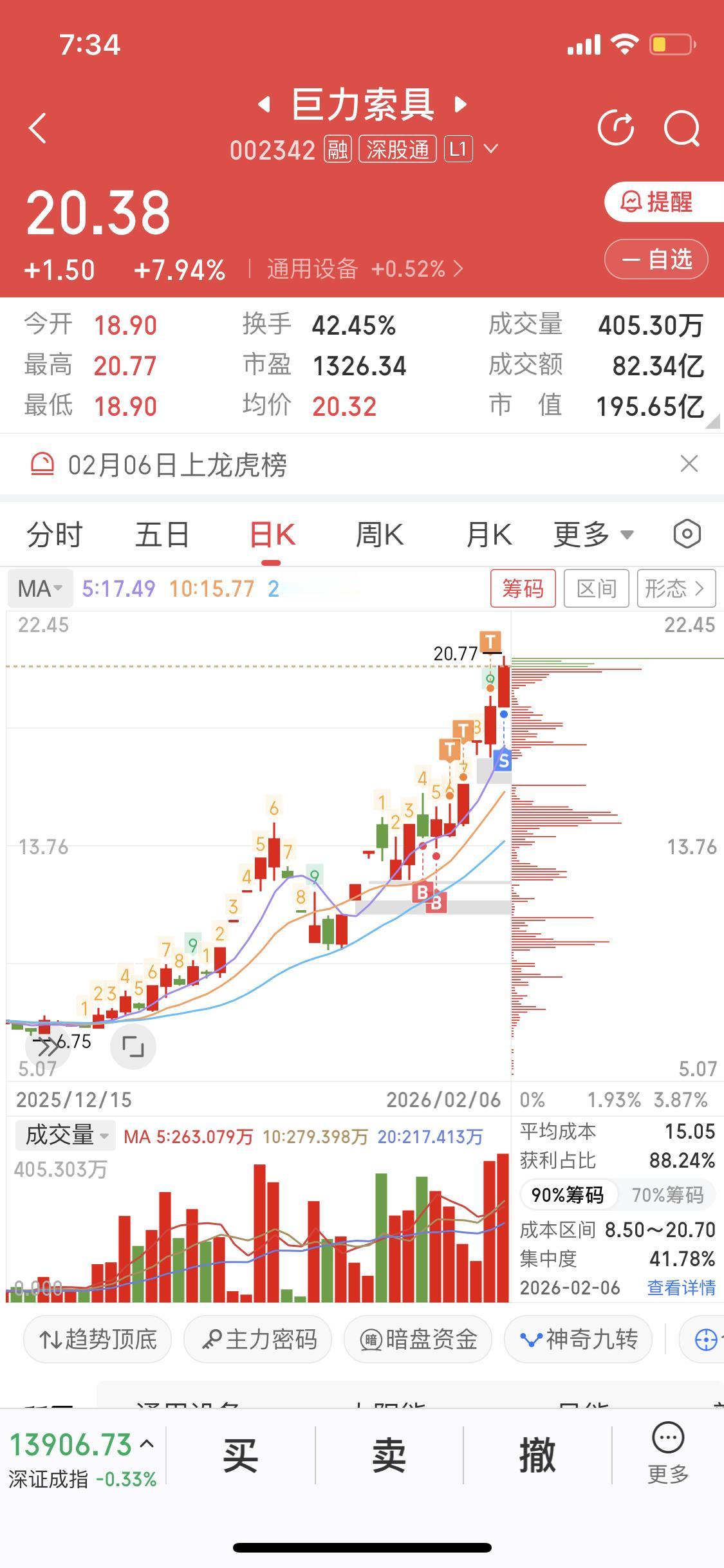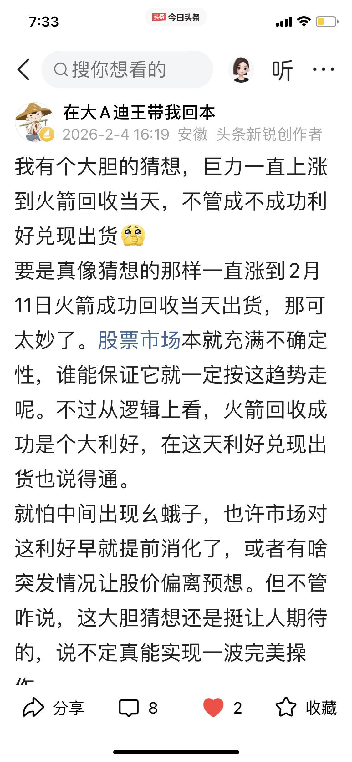 2月4号我发了条微头条,大胆猜想巨力索具的走势。没想到还真有点要应验的意思!从现在来看,在2月11号之前它一直在涨,虽说每天都不涨停,但这涨势就没停过。 接下来这情况也得好好琢磨琢磨。要是火箭回收成功,那肯定不少人会趁着这利好消息出货。但万一发射回收失败,股价大概率得大跌。今天是2月6号,距离11号没几天了,就看这几天它还能涨成什么样。