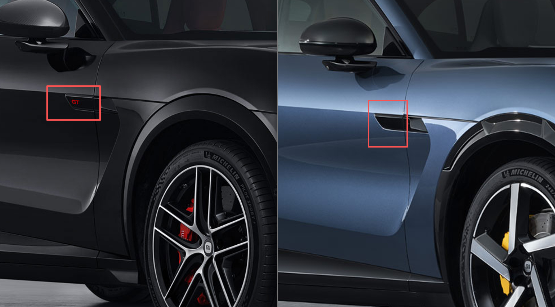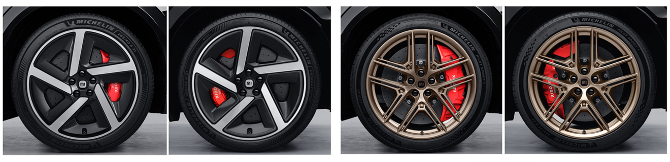 3.细节(1):YU7 GT标配21寸,前265、后295的大宽胎,并且这次的新卡钳也比曾经大出了一个量级,忙猜测是给了6活塞。另外值得一提的是,其中一个轮毂的卡钳相对较小(图7),应该是4活塞了,个人觉得这个应该是标配的卡钳,上面提到的270km/h极速应该是对应的这款卡钳。因此可以得出一个结论,标配的卡钳是四活塞,然后可以选配6活塞。