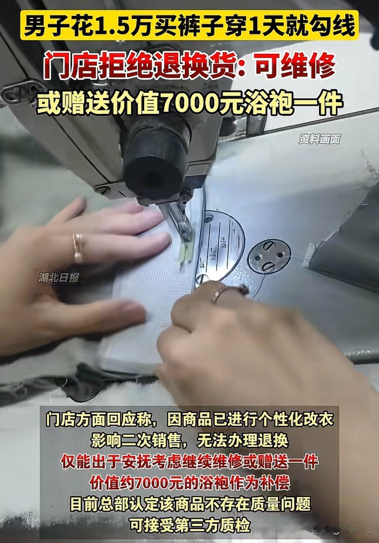 陕西西安,男子花15000多买了一条裤子,穿了1天就勾线了,商家拿回去修补后,男子觉得效果不明显,要求对方换货或者退货,可对方给出的解决方案,让他失望至极。网友:贫穷限制了我的想象。 1月15日,王先生去商场逛街,选中了一条15580元的裤子,他本来想着这是名牌裤子,质量肯定是有保障的。 买好裤子后,店员热情的帮他量了尺寸,裁了裤脚,并把裤子给他送了过去。 次日,王先生穿着这条崭新的裤子,精神抖擞地去上班,在写字楼里,他像往常一样正常活动。 1月17日,王先生却发现这条新裤子的裤腿出现了勾线的情况,他有些想不明白:这条裤子自己才穿一天,也没有碰到什么尖锐的东西,怎么就这样了? 他联系了商家,跟商家说明情况后,商家的态度也算客气,让他把裤子拿过去修补。 修好后,王先生去店里取裤子,可修过之后,勾线的地方还是很明显。 他觉得在没有人为损坏的情况下,这是裤子质量存在问题,他要求商家要么给他换条新的,要么把钱退给他。 可商家的回应却让王先生憋了一肚子火。 商家拒绝了王先生的要求,因为这条裤子裁过裤脚,属于‘个性化改衣’,会影响二次销售,不能退也不能换。 王先生有些无语:自己花15000多买的裤子,才穿一天就出现了勾线的情况,结果还不退不换。 之后店家给出了两个解决方案:一是继续帮王先生修补裤子;二是赠送王先生一条价值约7000元的浴袍作为补偿。 王先生难以接受这样的解决方案,他觉得自己花了一万五买条新裤子,才穿一天就坏了,结果现在要么是修修补补接着穿这条坏裤子,要么是拿件自己可能根本不想要的浴袍? 他觉得不合理,坚持认为就是裤子本身质量不行,要么换新的,要么退钱! 商家却表示:他们总部已经检查过了,认定裤子本身不存在质量问题,可以找第三方质检机构进行检测。 王先生花高价购买名牌裤子,本是出于对品牌的信任和对品质的追求,可裤子才穿一天就出现勾线问题,商家却以“改过裤脚影响二次销售”为由拒绝退换,这让他实在难以接受。 消费者购买商品,有权获得质量合格的产品,商家应该为产品质量负责。 《消费者权益保护法》第24条规定:经营者提供的商品或者服务不符合质量要求的,消费者可以依照国家规定、当事人约定退货,或者要求经营者履行更换、修理等义务。 如果王先生购买的裤子真的存在质量瑕疵,是可以主张换货或者退货的。 有网友说:有时候价格真的不代表质量,奢侈品牌的衣服有些也很娇气,需要仔细呵护。 还有一种可能,那就是是不是勾到什么东西,或者扎到什么东西了? 也有网友说:修改过的衣服、裤子真的不好退,因为这个是给你量身改的,再卖给别人,别人也不会要,退回去也难以处理,所以商家肯定不愿意。 对此,大家怎么看?