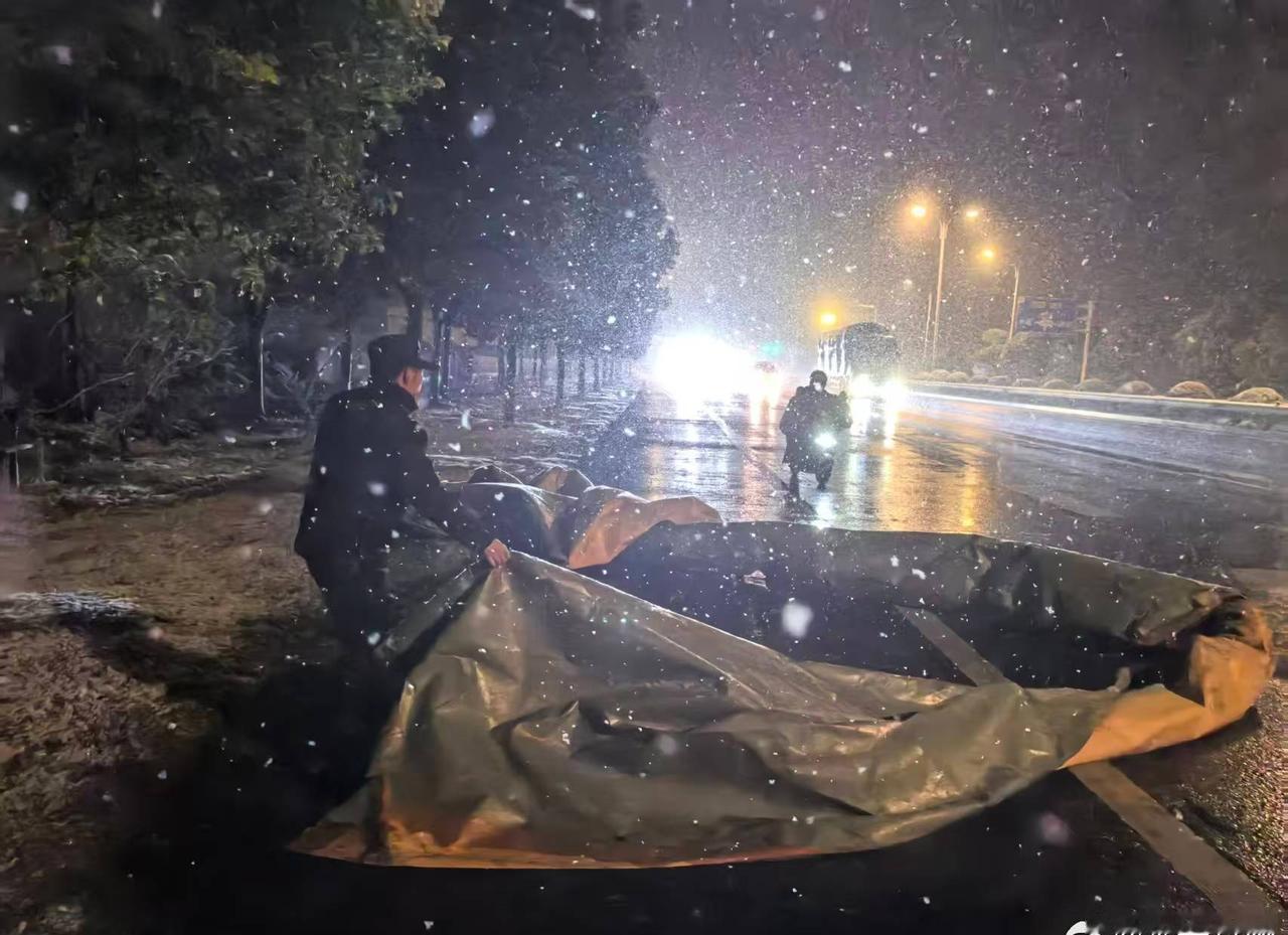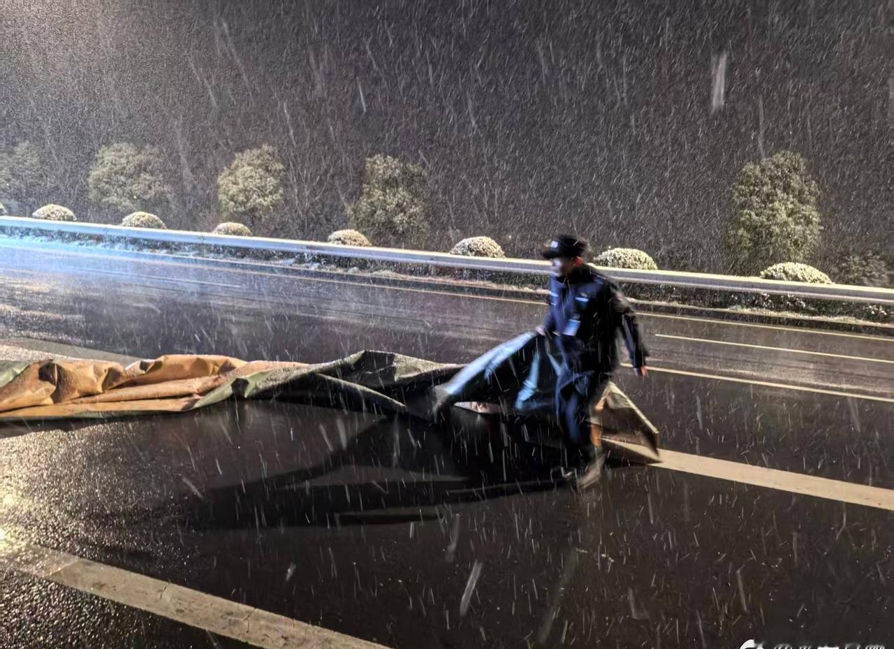 2月6日夜,寒潮侵袭,风雪交加。金坛公安分局水北派出所警力在执行出警任务途中,发现路边杆子和一大块油布被狂风吹倒,横卧路面,严重影响夜间行车安全。警力随即靠边停车,不顾风雪扑面,俯身清理。他们合力将沉重的杆子移至路边安全地带,又将散落的油布仔细收拢、捆扎牢固。风雪中,警服很快被雪花打湿,但他们动作迅速,不到十分钟便将障碍全部清除,及时消除了道路交通隐患。清理完毕,他们搓了搓冻红的双手,悄然返回警车,继续奔赴处警现场。夜色中,那抹警蓝身影,温暖而坚定。