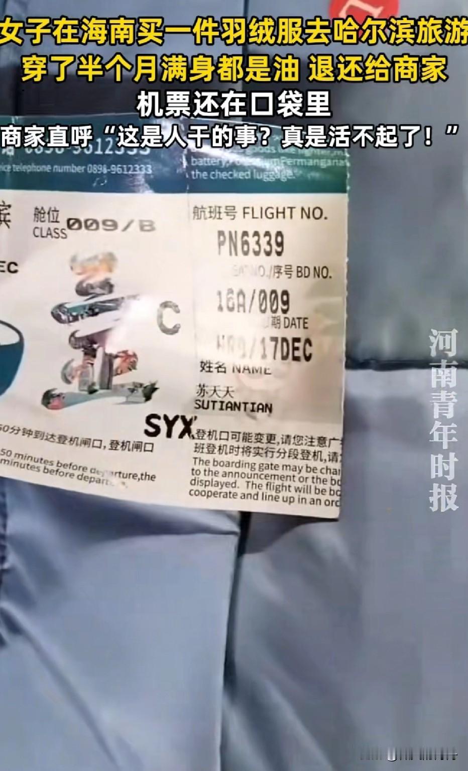 为何有如此厚颜无耻之人?海南的苏天天[比心] 你出名了,可惜是坏名声,勿以善小而不为,勿以恶小而为之!机票你都买得起,差这一件羽绒服的钱? 多年前我有个邻居也是这样,白嫖党,买了一件羽绒服,出差穿了一周,标签没拆,回来去商场退了。从那开始我就不和她交往了。 她的朋友在哪里?有没有看到这条新闻,老天开眼,让她把机票忘在兜里,给你们机会让你们看清楚,看到了,麻利儿断舍离吧!