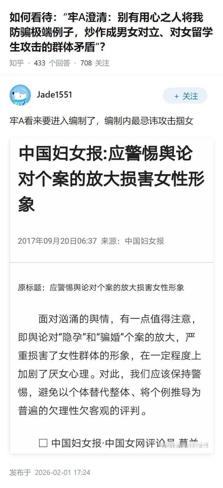 如何看待:“牢A澄清:别有用心之人将我防骗极端例子,炒作成男女对立、对女留学生攻