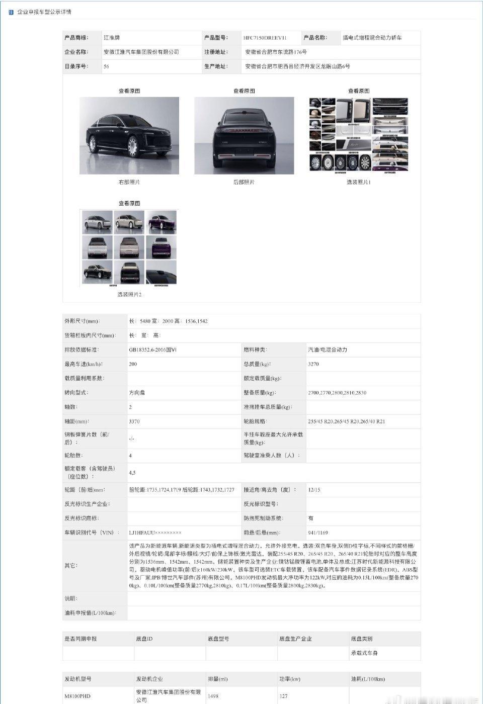 江淮有两款新的华为尊界 S800 车型通过了工信部申报,主要是对增程器进行了升级,功率从 125 千瓦升级至 127 千瓦(M8100PHD)。
