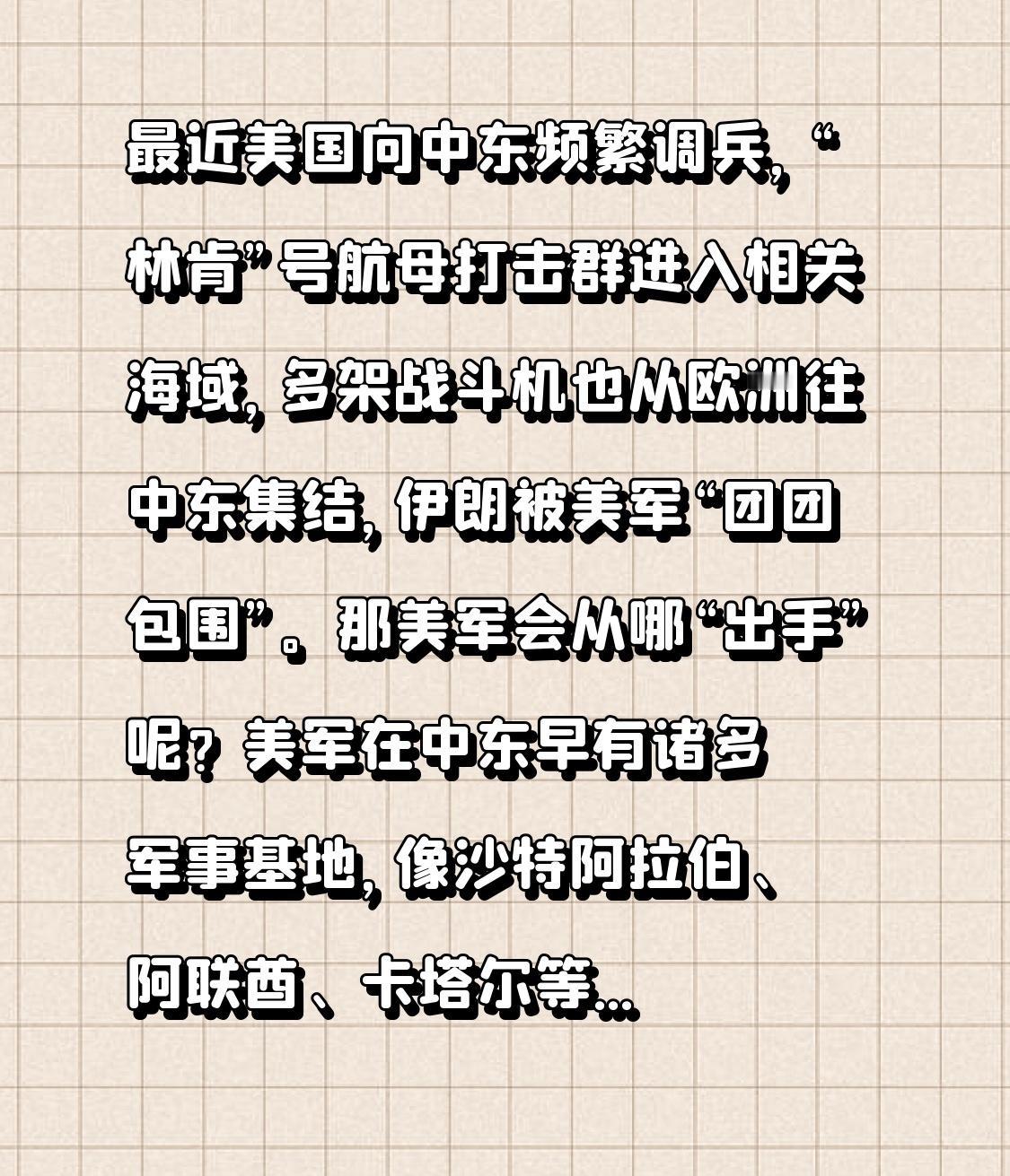 最近美国向中东频繁调兵,“林肯”号航母打击群进入相关海域,多架战斗机也从欧洲往中东集结,伊朗被美军“团团包围”。那美军会从哪“出手”呢? 美军在中东早有诸多军事基地,像沙特阿拉伯、阿联酋、卡塔尔等国都有他们的身影。这些基地能为美军提供情报收集、空中打击、地面支援等关键支持。而且美军还会借助海上和空中力量,在红海、波斯湾等海域巡逻监视。自 9·11 后,美军以反恐为由在中东扩大军事存在,如今局势复杂,其行动也拓展到打击极端组织、支持盟友等多方面。这次围攻伊朗,这些军事基地大概率会成为美军行动的重要起点。
