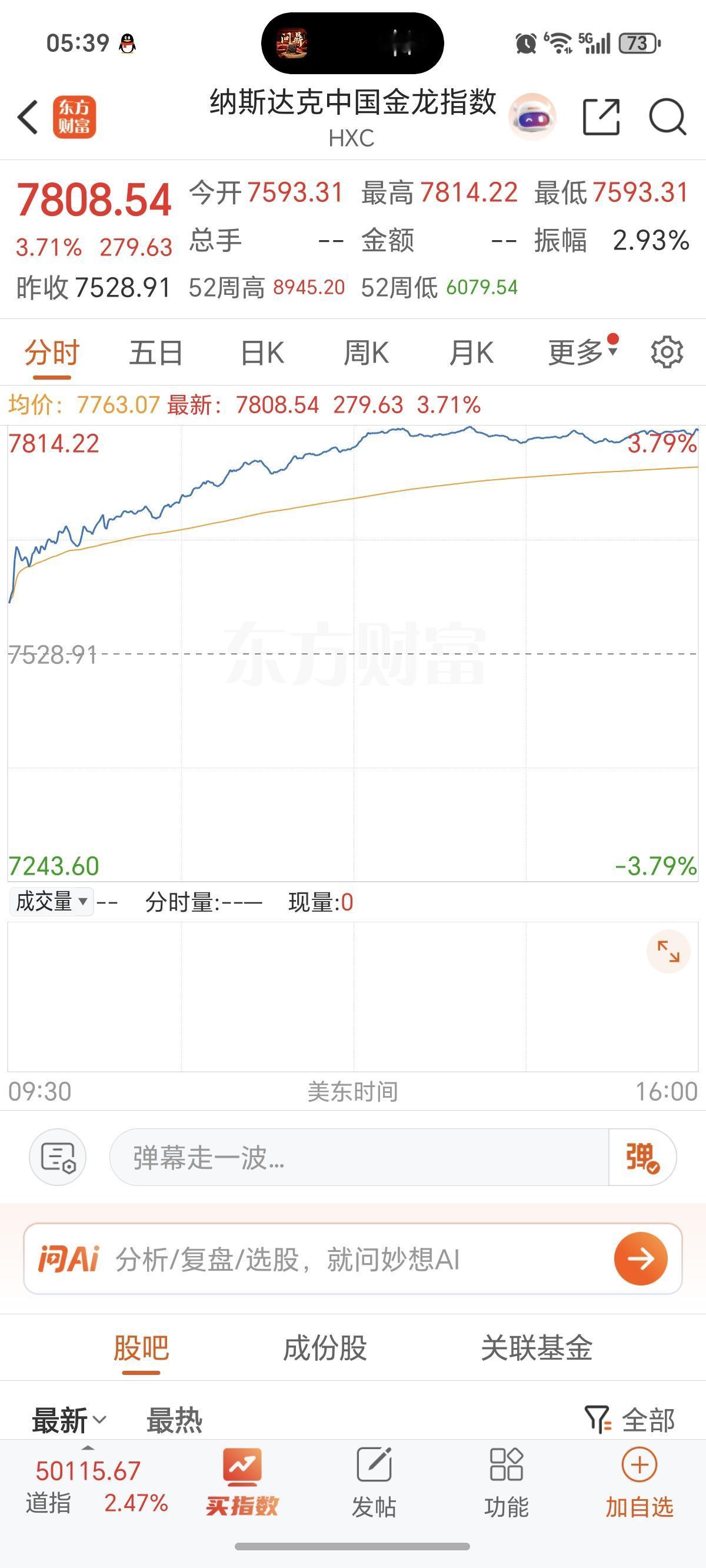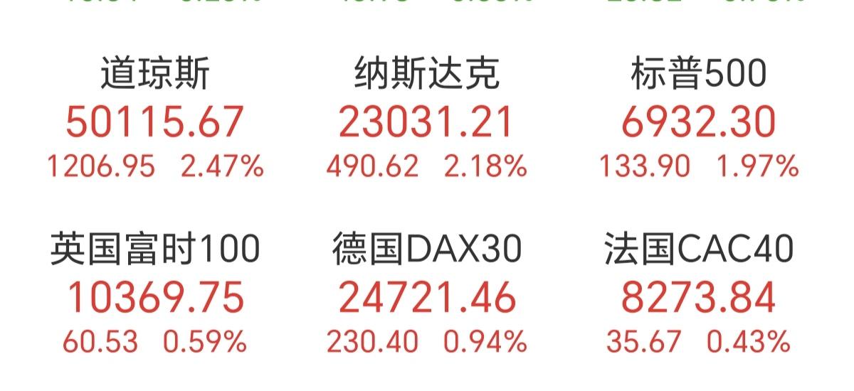 2.7周六 早晨 一觉醒来,美国全线暴涨,三大指数涨幅均超2%,周五抄底的兄弟们有福了。 白银期货涨1%,黄金涨近2%。下周一A股高开是肯定的。 纳斯达克中国金龙指数更是惊人,涨3.7% 看看下周大A能不能雄起来!给大家发个大红包。