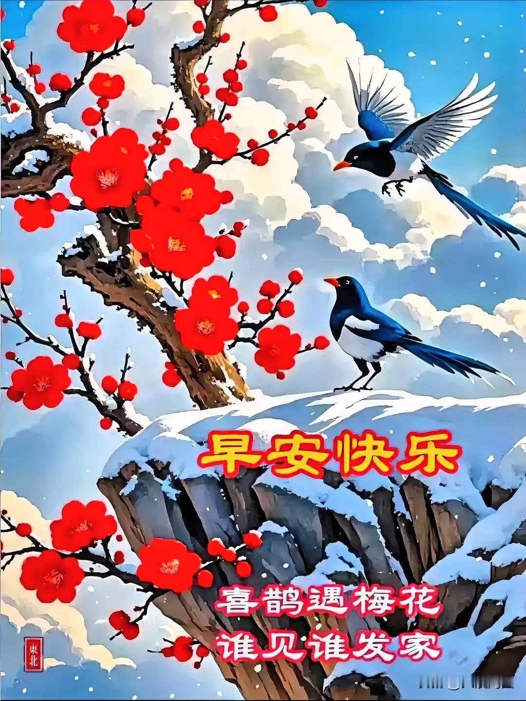 喜鹊报春至,梅花笑靥开。 喜鹊 枝头喜鹊 清早喜鹊枝头叫 雪梅枝头喜鹊闹 红梅报喜图 红梅喜鹊