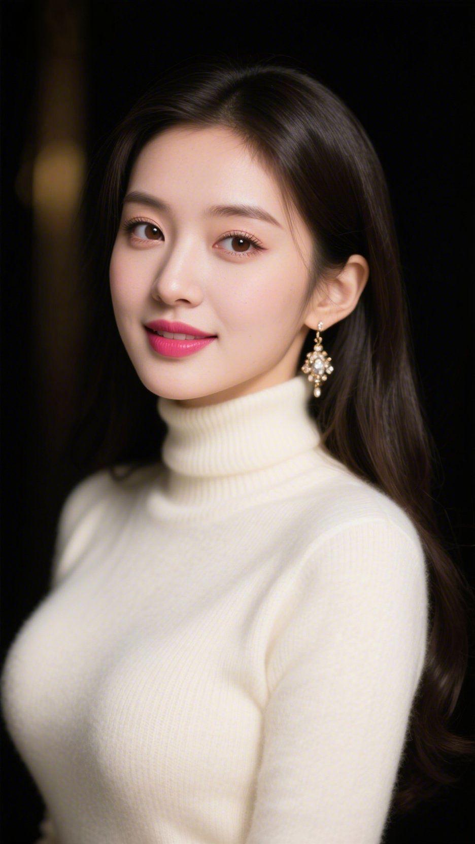 暖绒间的柔光轻和 暗调背景里,米白高领绒衫像裹了层软云,温然衬着舒展的气息。长发垂落肩侧,发梢沾着细碎的光,耳间珠饰轻晃,漾开一点柔亮的闪。 唇色是恰好的暖粉,笑意漫开时,像把轻和揉进了软绒里——并无张扬的修饰,是绒衫裹着的温,是耳饰坠着的柔,是眉眼间漫开的松弛。像寒夜里撞见的一团软光,不必刻意靠近,便觉暖意轻笼。 原来温柔的悦目,是藏在软绒里的舒展模样。 暖绒温柔穿搭 日常松弛感