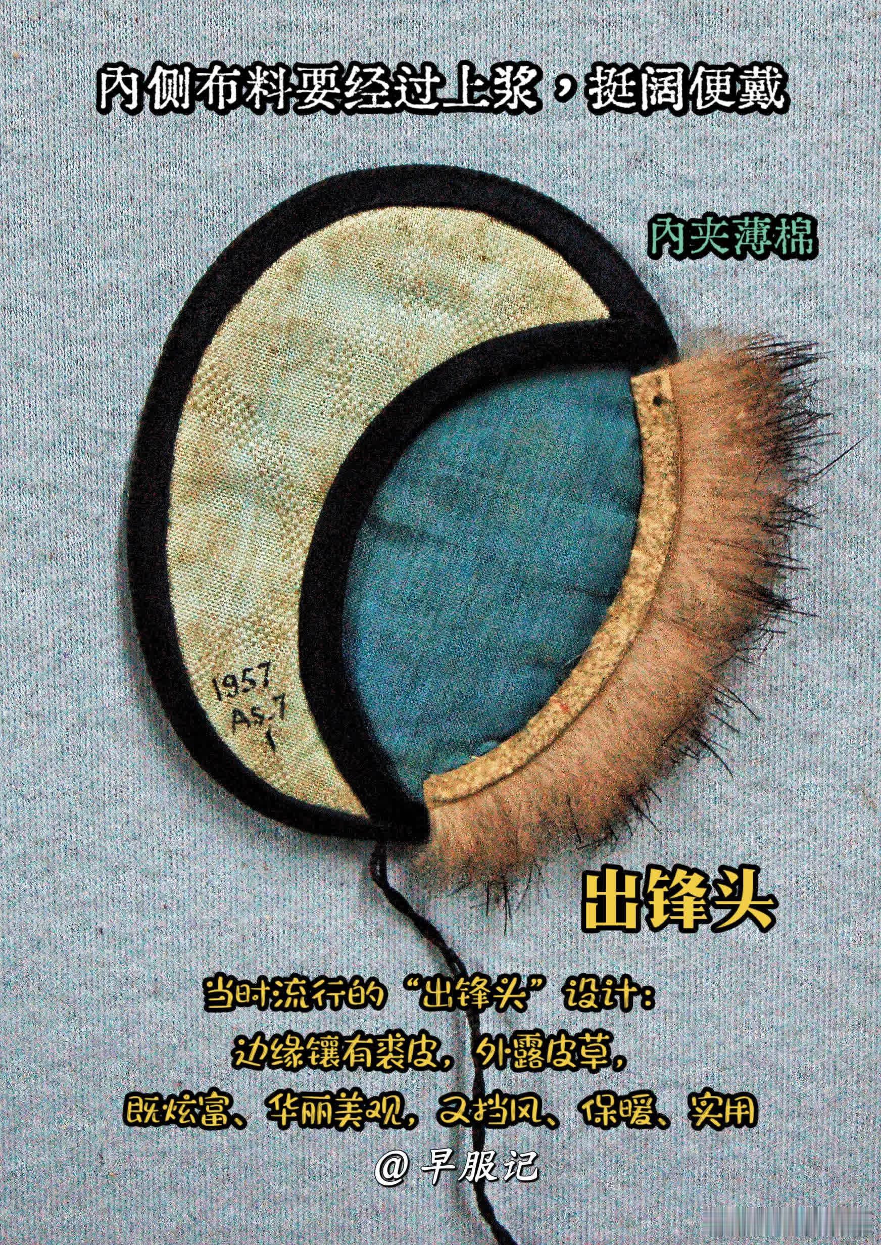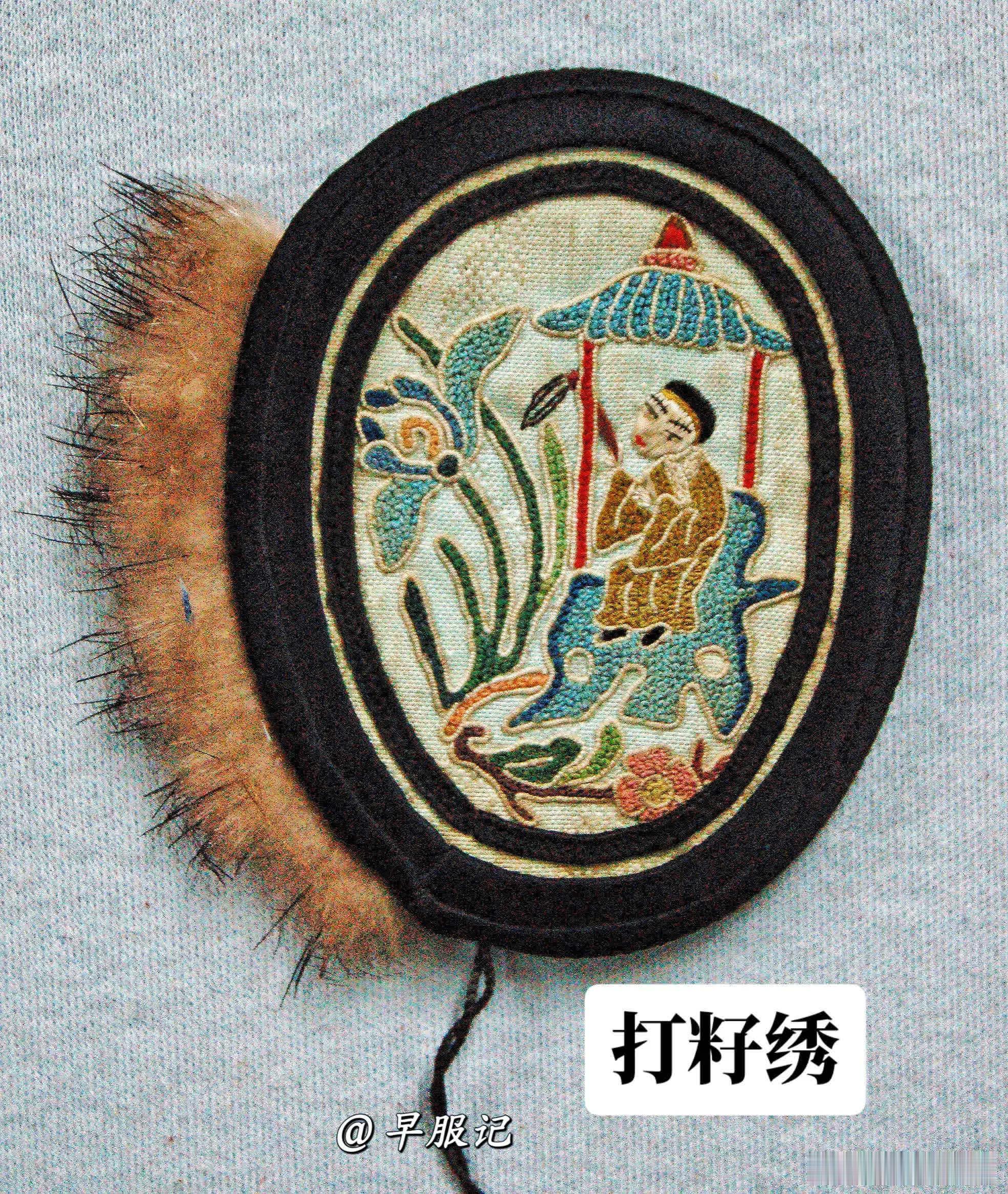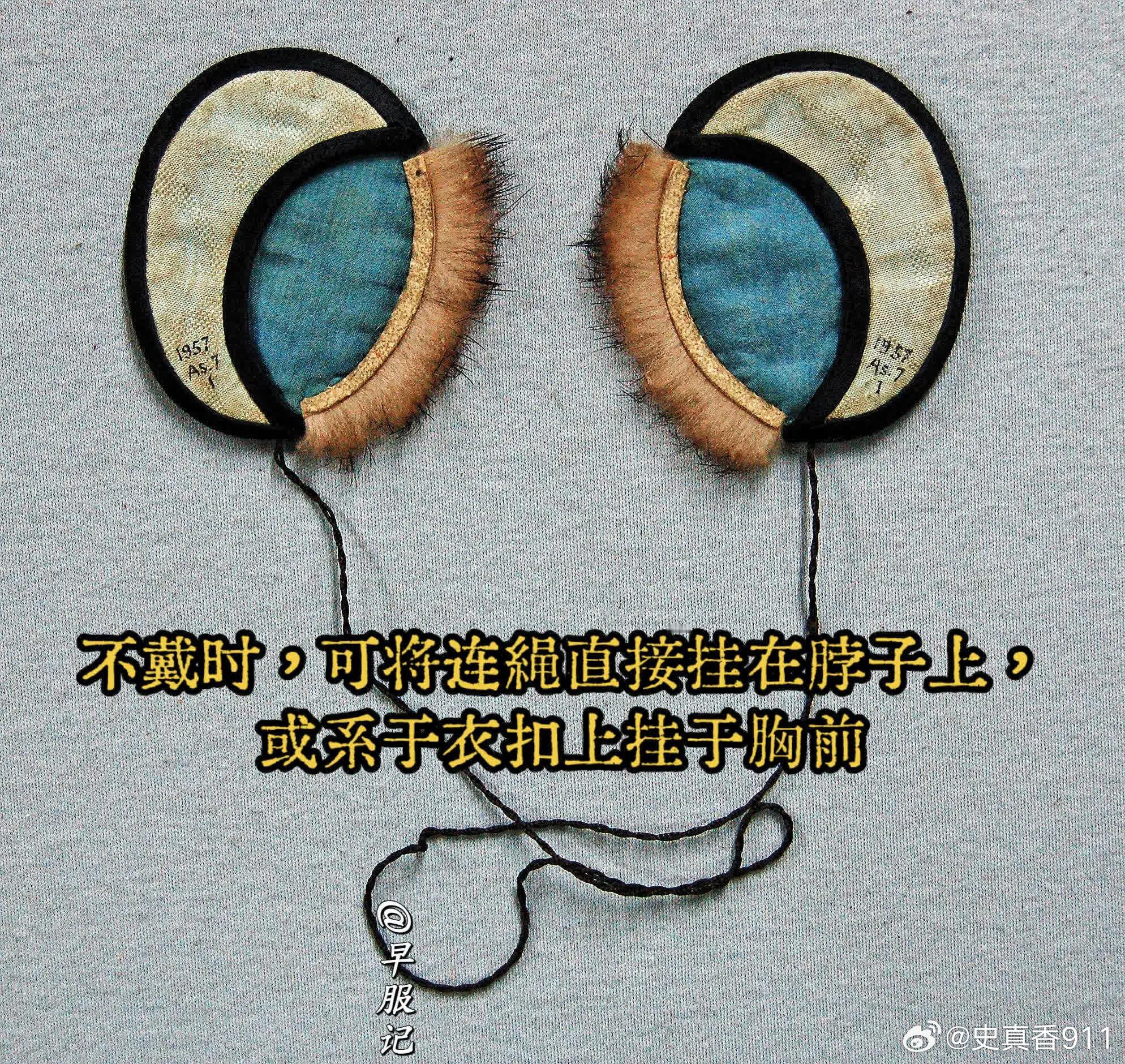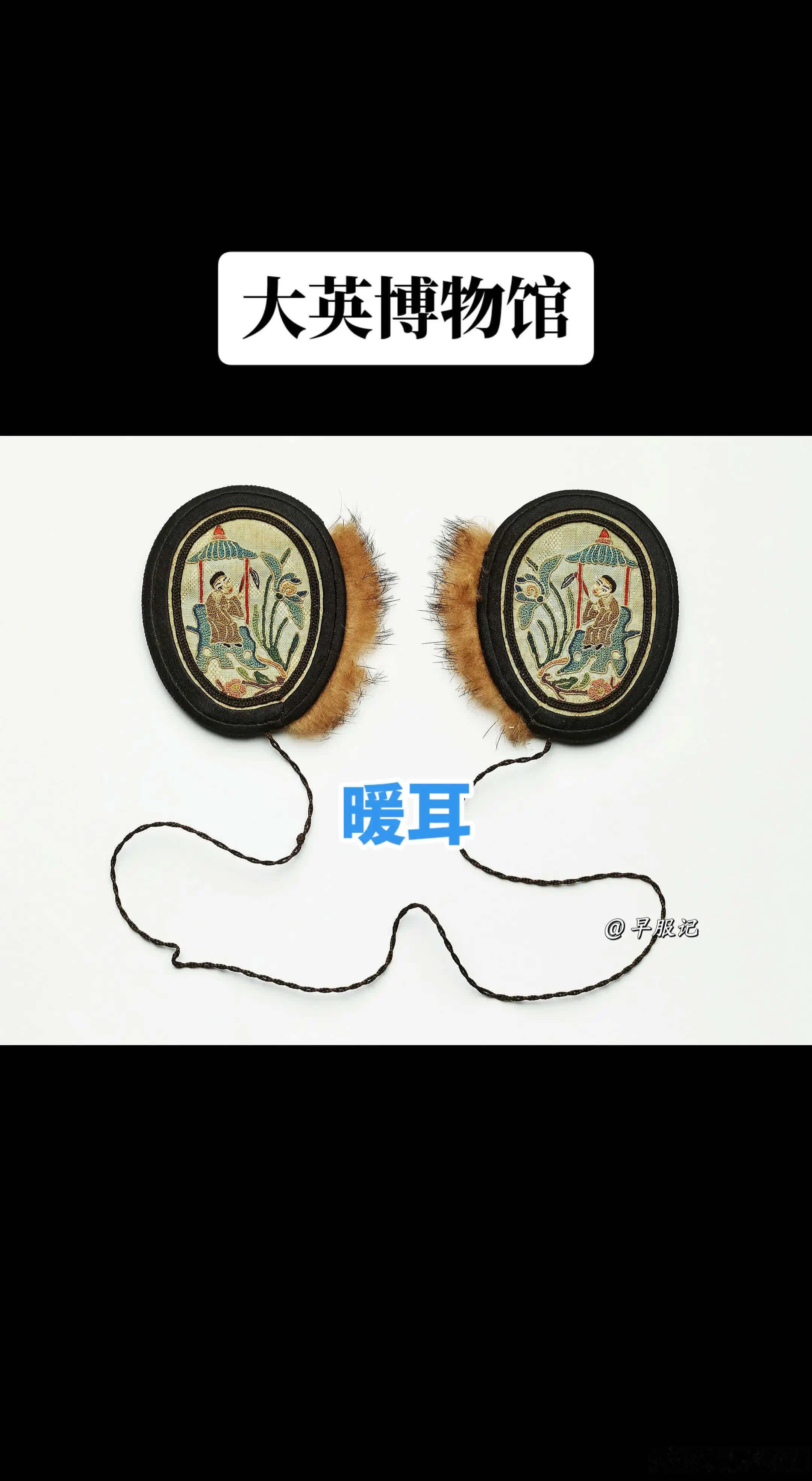 「古人冬季装备」大英博物馆藏【中国北京•晚清•打籽绣人物庭院花卉纹出锋边椭圆形暖耳】,长7.50厘米,宽7.50厘米(含毛边),内夹薄绵/棉。1957年IC Turnbull(特恩布尔夫人)捐赠入藏。2023年曾在【晚清百态展】展出。 【使用方法】两只暖耳之间,以细线相连,不戴时,可将连绳直接挂在脖子上,或是系于衣扣上悬挂于胸前,方便随身携带。使用时,只需将暖耳窄边打开,套在耳朵上即可。 【细节】:捐赠者:IC Turnbull (特恩布尔夫人)收集地点:中国北京所属部门:亚洲博物馆编号:As1957,07.1资产编号:1613658646捐赠时间:19571957 年登记册:耳罩,黑色和浅蓝色,带有刺绣装饰,饰以浅色柔软的毛皮,内衬蓝色布料;一对用扭曲的黑色绳子系在一起。 【展览历史】:2023年5月18日至10月8日,伦敦,BM,G30峰会,“中国隐秘的世纪” 【清代暖耳形状】清代北方一带盛行“暖耳”,又称:耳囊、耳衣、耳罩、耳套、耳圈、耳捂、耳按儿、耳掩儿、皮耳朵。暖耳作为功能性服饰,在我国有悠久的历史,由唐代耳衣演变而成,历经元明变迁而成清代的新式样——清代出现了可罩于耳轮、独立佩戴的暖耳,更合乎耳廓形态,略向前倾斜,样式更有动势和美感。❶形状以桃形为主,男子与女子均佩戴。也有蝴蝶、荷花、金鱼等其他形状,但较为少见,多为年轻女子和儿童所佩戴。❷清代暖耳材质转向以丝棉为主;或者边缘镶皮毛,此即当时流行的“出锋头”,炫富的表现。❸图案多刺绣人物、瑞兽、花鸟、杂宝、诗句等,在方寸之间,各擅胜场。晚清民国时期的刺绣暖耳较为兴盛。历史