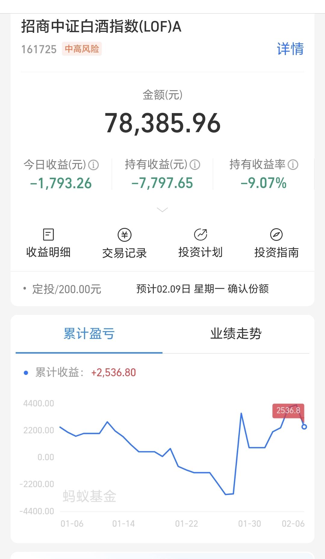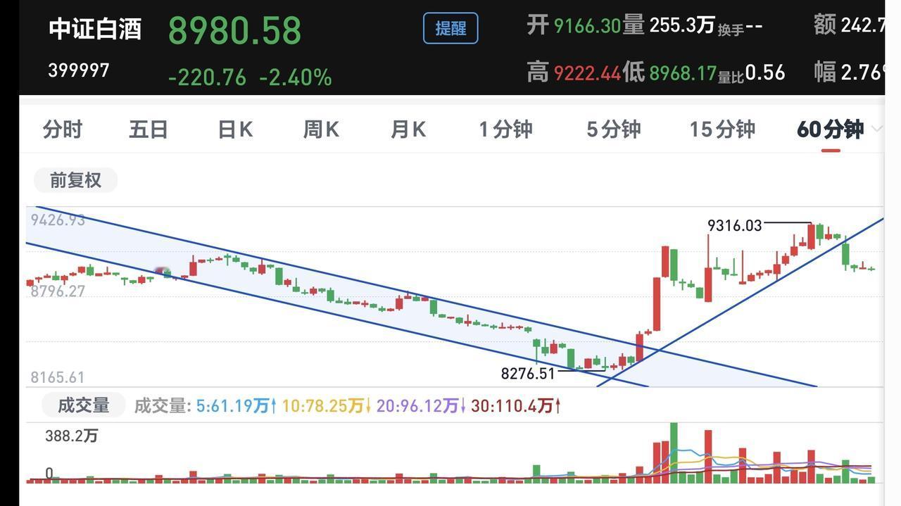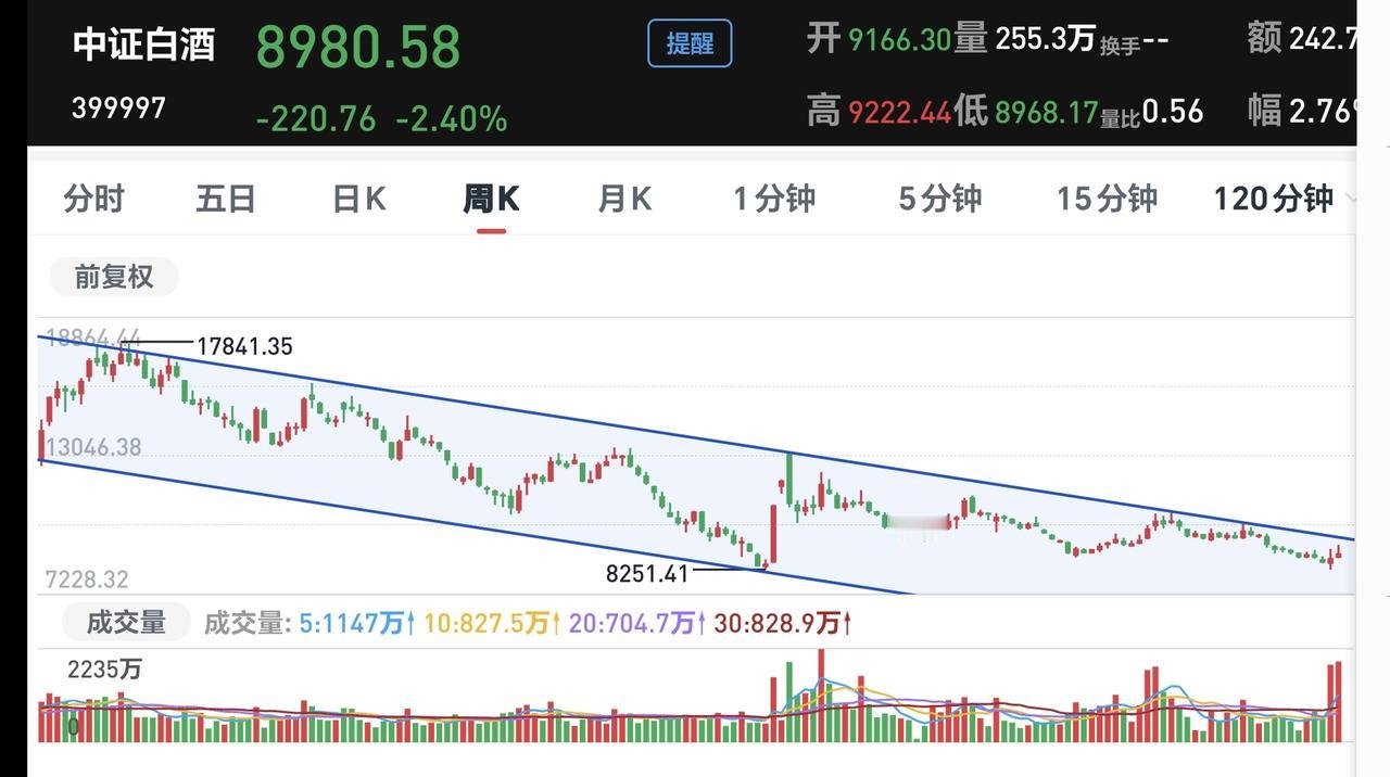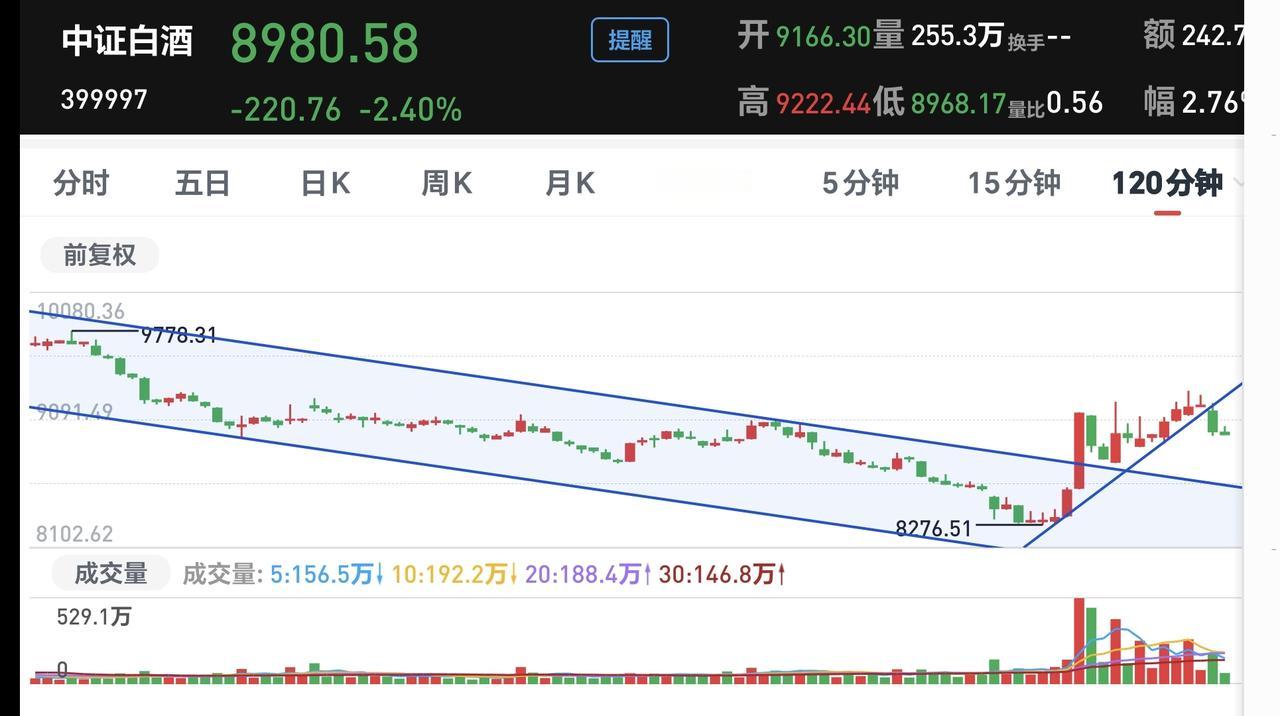 基金:白酒板块是什么情况 昨天下跌幅度最大的三个板块是:军工板块,人工智能板块,白酒板块,白酒板块下跌幅度排名第三,净值更新下跌了1.60%,持有人数在所有板块当中排名第19位。 看下面的截图2,这是白酒板块60分钟k线图,上涨突破下跌通道上轨线以后持续上涨,现在是在回踩确认过程当中,前段时间的突破是一个有效突破,回踩确认以后大概率会继续上涨。 看下面的截图3,这是白酒板块120分钟K线图,走势情况与60分钟K线图相似,现在也是突破以后的回踩确认过程中,120分钟下跌通道上轨线的突破也是有效突破,回踩确认以后也是有望再创新高。 看下面的截图4,这是白酒板块日k线图,前面的大阳线也是突破了日线级别下跌通道的上轨线,只要回踩不超过那个大阳线一半的位置,后面大概率会继续上涨再创新高。 看下面的截图5,这是白酒板块周K线图,这也是我们需要重点观察的一个下跌通道,后面一段时间主要观察能不能上涨突破这个下跌通道的上轨线,如果能够上涨突破这个下跌通道的上轨线,这个板块的反转就是大概率事件。 白酒板块基金,我持有78385元,持有亏损7797元,持有亏损率9.07%,累计收益2536元,每天定投200块钱。 这只基金的目标仓位是10万块钱,目标收益率是50%,时间目标是一年之内。 花一秒钟点赞,花30秒钟评论就是对我最大的支持,谢谢大家的支持。