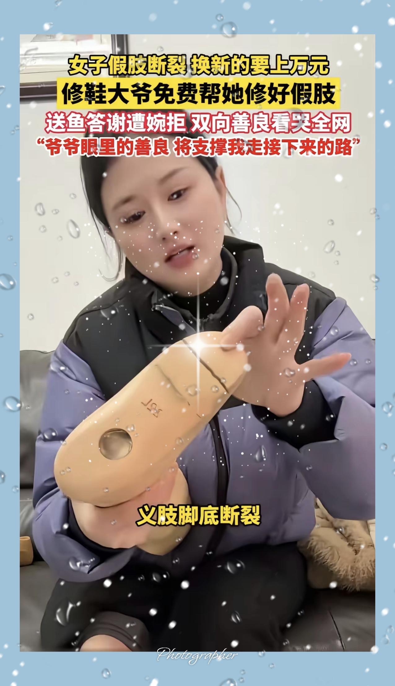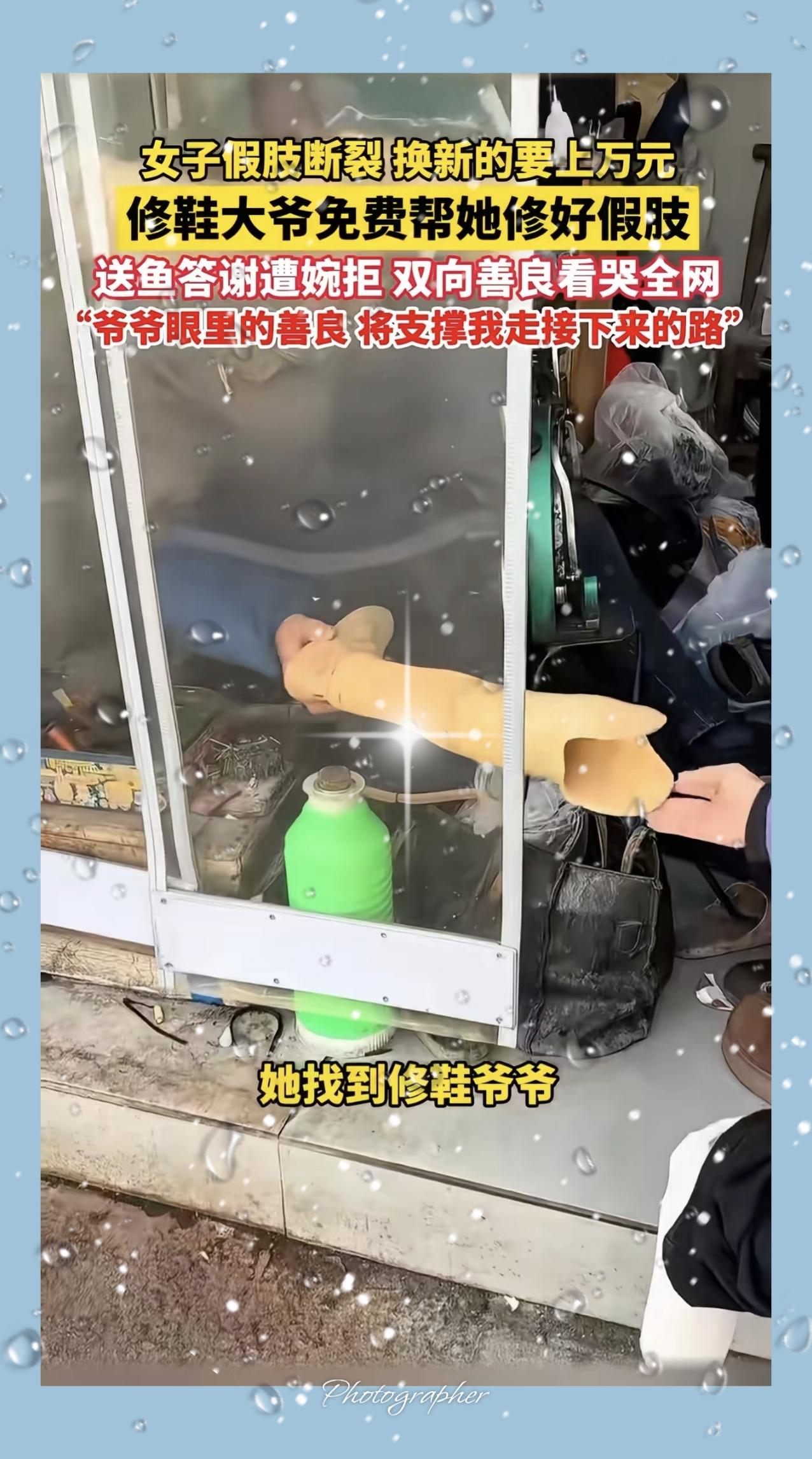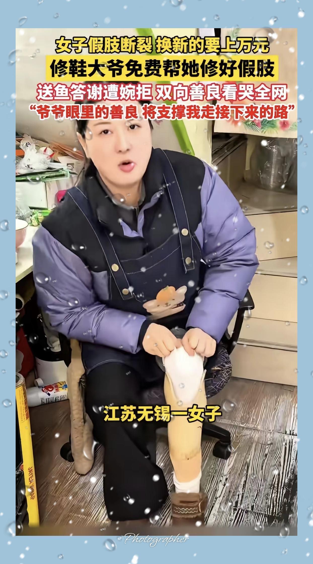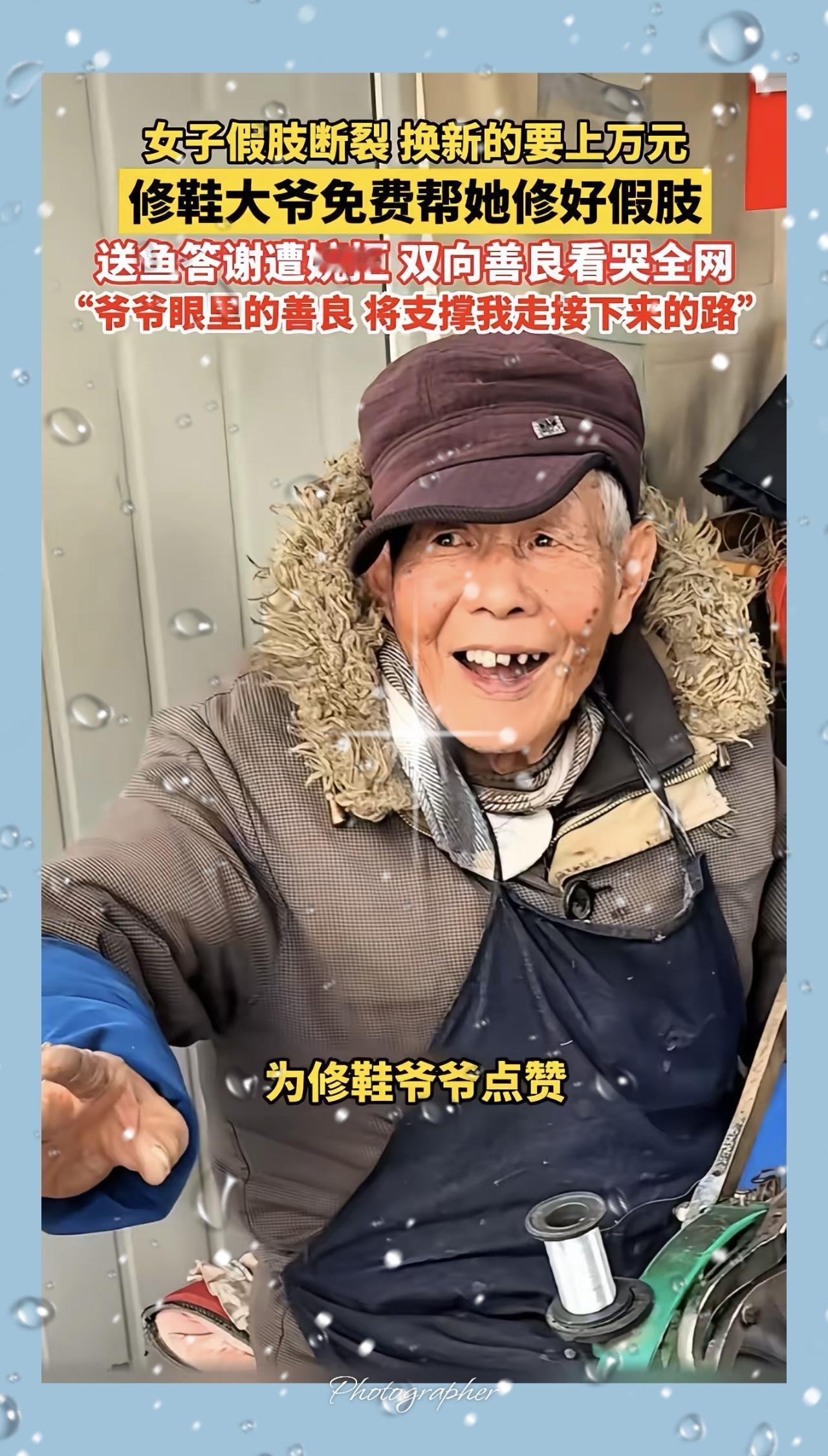 一大早看哭了!江苏无锡,女子假肢断裂,医生说换新的上万元,女子没钱,就拿着假肢问修鞋大爷能不能修?修鞋大爷修了一辈子的鞋子,从来没修过假肢,但他看到女子这么可怜,还是帮女子修好了!可是女子问大爷多少钱,大爷居然说不要钱。 大爷从没想过靠手艺牟利,更懂普通人生活的难处,一句“我试试”,不仅接下了没做过的活,更接住了陌生人的窘迫与希望。他用心粘补、仔细打磨,修好的不只是假肢,更是女子继续走路、好好生活的底气。 真正的善良从不大张旗鼓,藏在街头小摊,藏在粗糙却温暖的双手里。比起昂贵的物质帮助,这种不添麻烦、不图回报的伸手,最戳人心。生活再难,总有人用微光温暖彼此,这才是最珍贵的人间烟火。 你遇到过这样默默暖心的普通人吗?